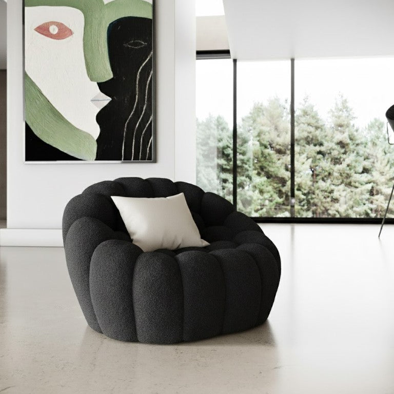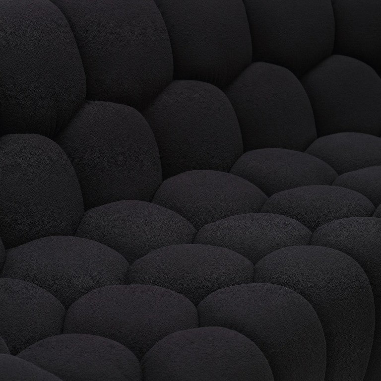 Elevate your living space with the Yolonda curved accent chair — a modern, sculptural piece that blends comfort and contemporary design. Upholstered in plush black teddy fabric and featuring hexagonal tufting, this chair makes a sophisticated statement while providing supportive seating and durable construction for everyday use.