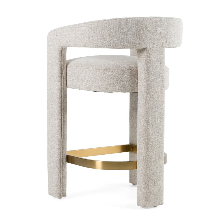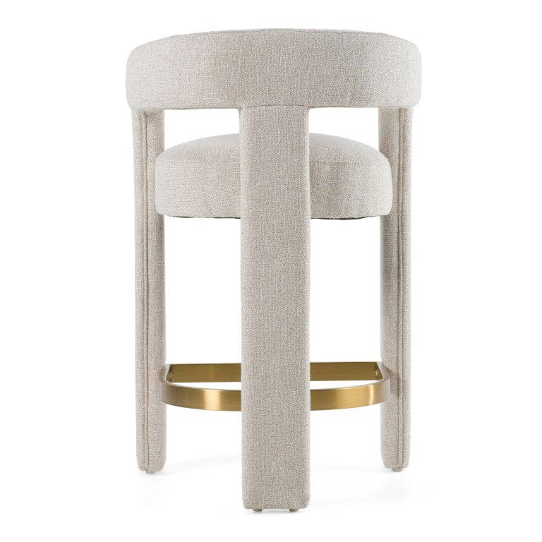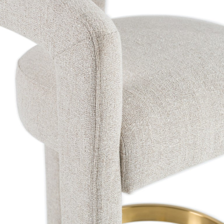 Elevate your kitchen island or bar area with a refined counter chair that blends modern silhouette and warm, neutral upholstery. The chair’s rounded back and subtle curves deliver comfortable support while brass-accented stainless steel detailing introduces a luxe touch. Built with a solid and engineered wood frame and cushioned with foam, this piece balances durability and everyday comfort for contemporary living spaces.