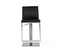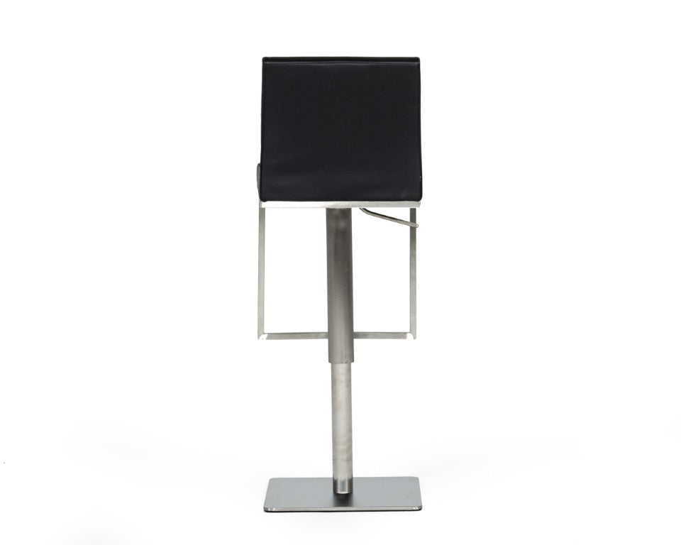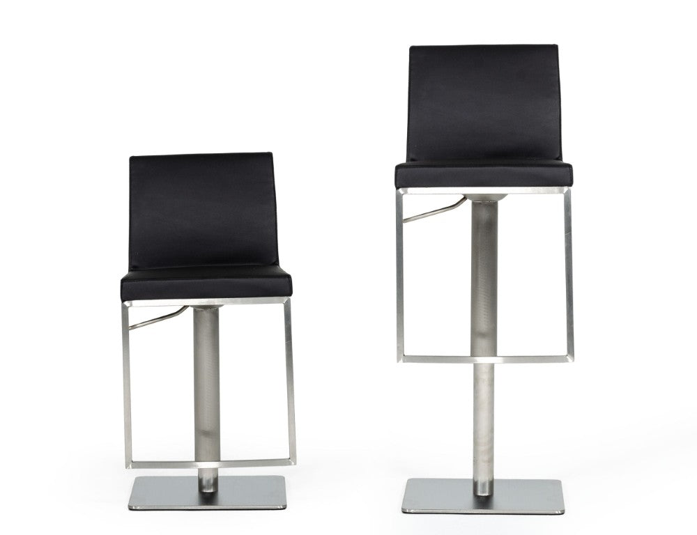 Brighten your kitchen island or home bar with the Folsum—an elegant, modern bar stool that blends minimalist design with everyday comfort and durable construction. Upholstered in soft black vegan leather and finished with brushed stainless steel and chrome accents, it offers smooth swivel action, a supportive low back, and an adjustable air-lift for the perfect seating height.