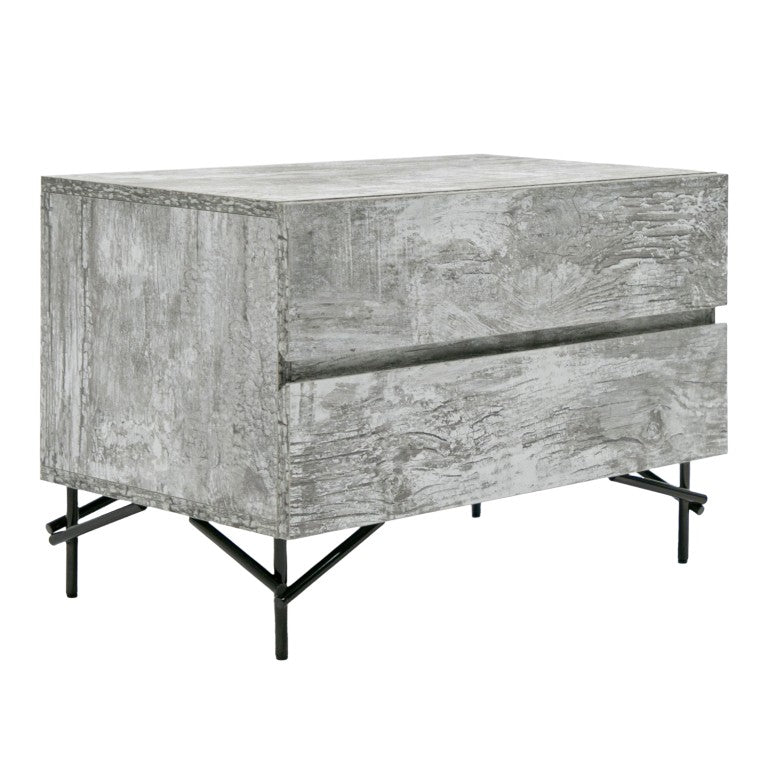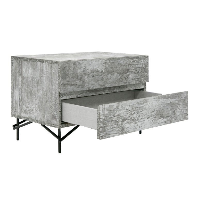 Elevate your bedroom with this Italian-designed nightstand from the Aria collection — a modern, textured piece that pairs rustic character with contemporary lines. Its tiger wood matte grey finish and black metal legs create a striking contrast, while engineered construction ensures lasting durability. Ideal next to the matching upholstered bed, this nightstand brings refined style and practical storage to your sleeping space.