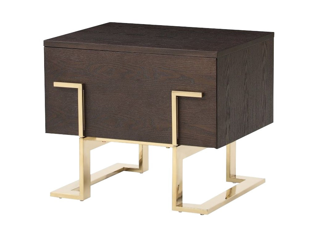 Elevate your bedroom with a sleek blend of modern design and subtle industrial character. This nightstand pairs a smoked ash veneer with polished champagne gold legs and accents for a refined, mid-century inspired look that becomes a focal point whether placed beside a bed or used as an accent table. Its clean lines and thoughtful details provide both style and practical storage without overwhelming a room.