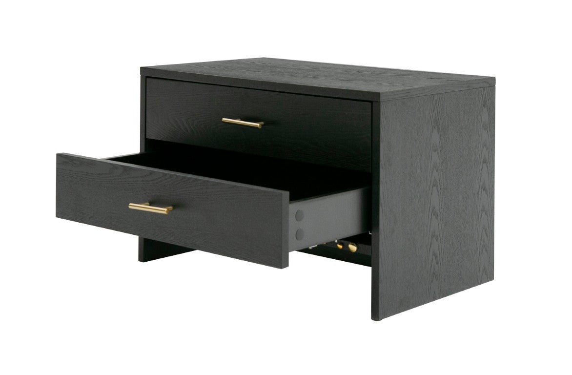 Elevate your bedroom with a sleek, modern nightstand that blends sophisticated materials and practical storage. The Wales Modern Grey Ash 2-Drawer Nightstand pairs a rich dark grey ash veneer with subtle brass detailing for a refined look that fits contemporary and transitional interiors. Its two roomy drawers keep bedtime essentials organized while the compact footprint makes it ideal for smaller bedrooms or as a secondary bedside table.