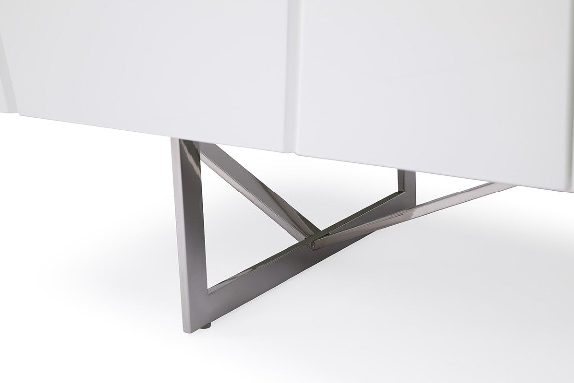 Sleek, modern and quietly functional, this dresser brings contemporary style and everyday utility to the bedroom. The high-gloss white finish and diagonal drawer cutouts create a refined, architectural look, while stainless-steel hairpin legs give it an airy, mid-century modern feel. Six smooth-glide drawers provide organized storage for clothing and essentials, and the durable construction keeps the piece looking fresh for years.