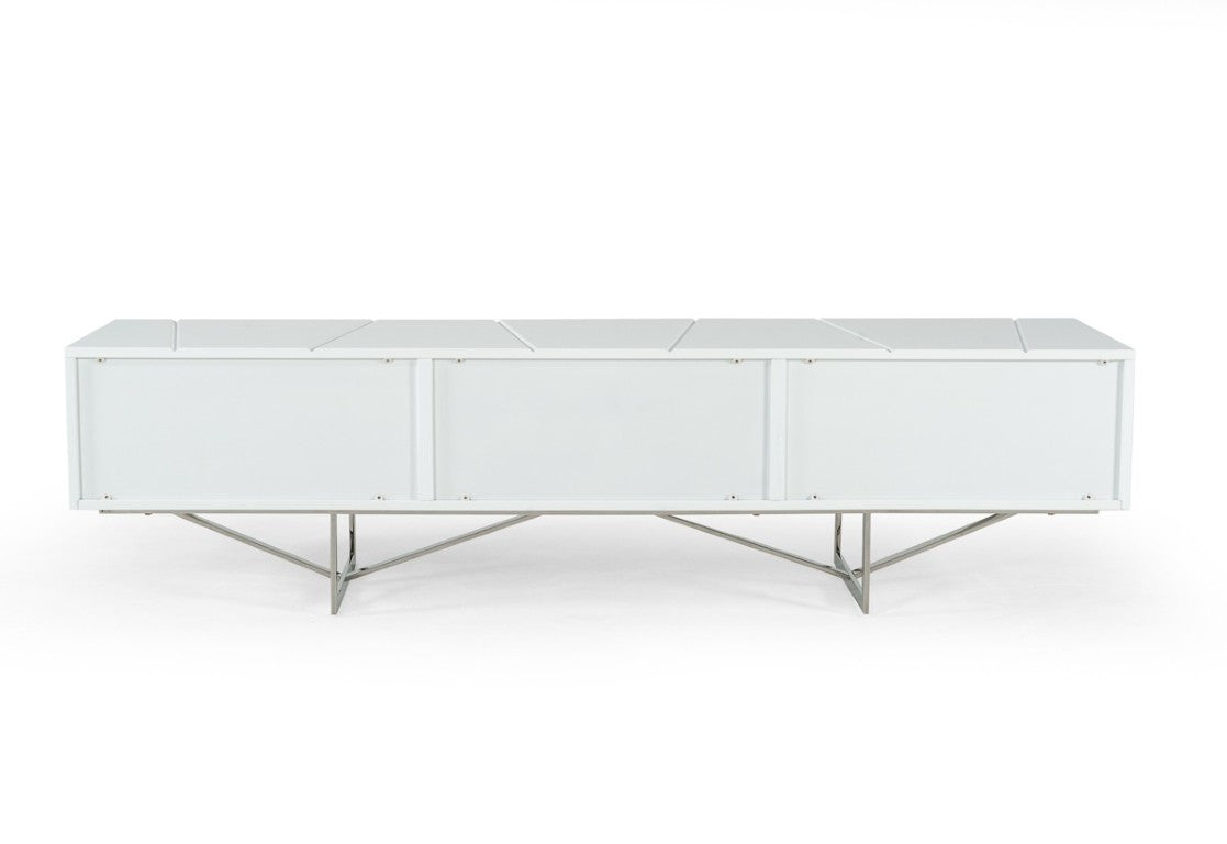 Bring contemporary polish to your living room with this striking modern TV stand. Finished in a high-gloss white lacquer, it blends clean lines and geometric details for a sleek, upscale look that complements minimalist and modern decor. Spacious storage and sturdy metal legs make it both attractive and functional for media setups.