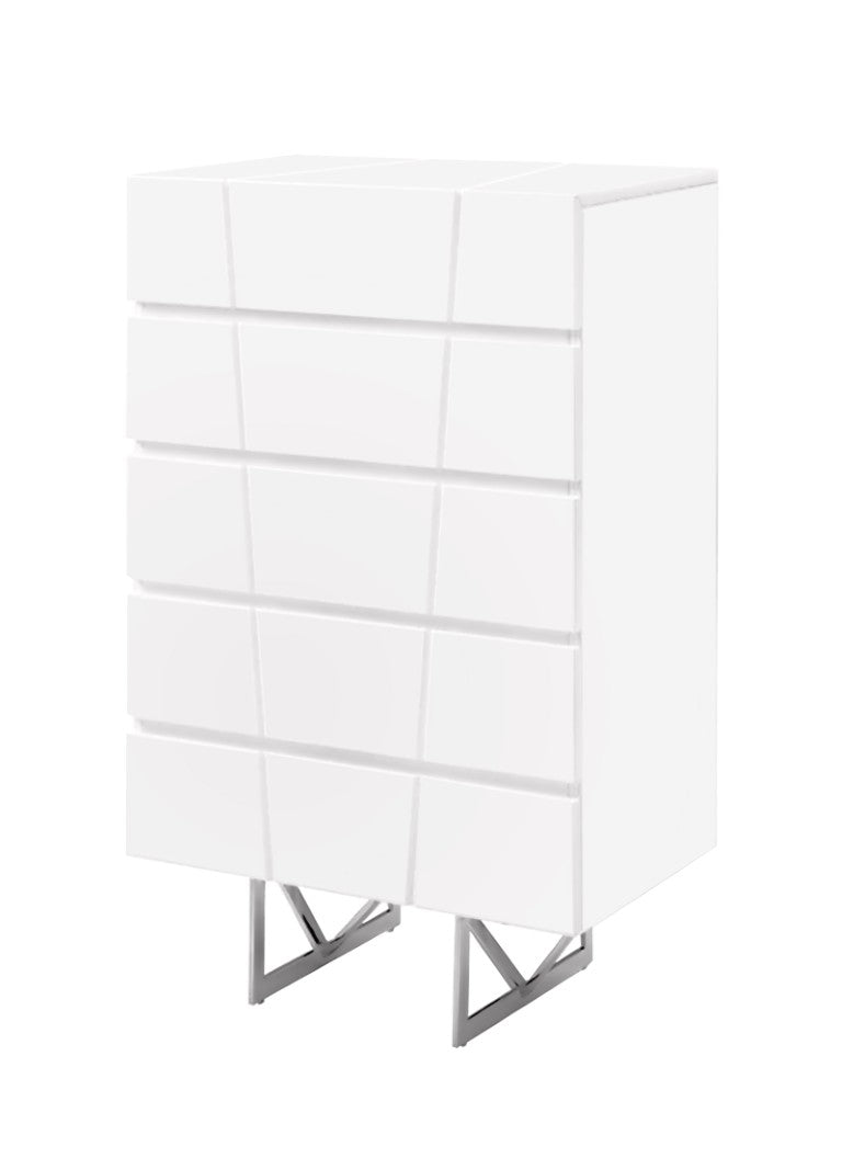 Bring modern minimalism and practical storage into your bedroom with this sleek, high-gloss chest. Its clean, boxy silhouette is elevated by diagonal cutout accents and polished stainless steel hairpin legs, creating a contemporary focal point that pairs beautifully with a range of décor styles. Five smooth-gliding drawers provide quiet, organized storage for clothing and essentials, while the durable glossy finish makes maintenance effortless.