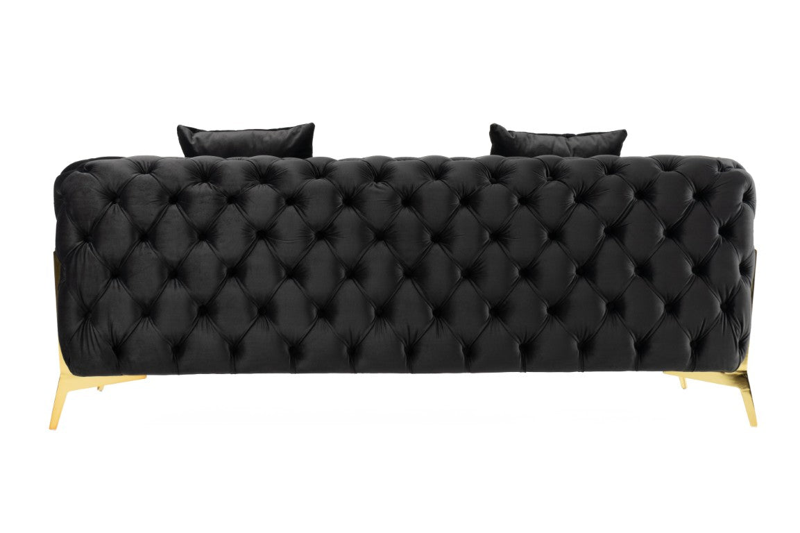 Elevate your living space with this elegant transitional loveseat upholstered in sumptuous black velvet. Designed to blend classic tufted details with contemporary silhouette and gold-finish metal legs, it offers refined comfort for two—ideal for intimate seating areas, apartments, or as a statement piece in larger rooms. Durable construction, removable cushions, and included toss pillows make it both stylish and practical for everyday use.