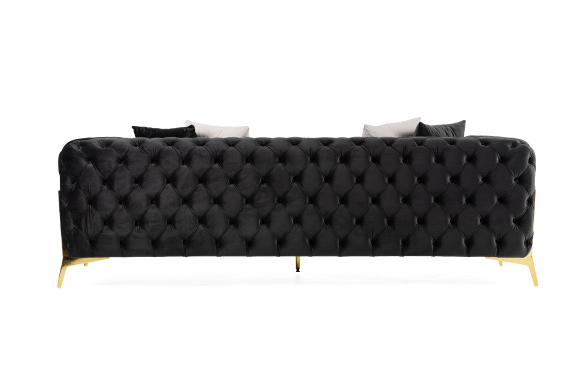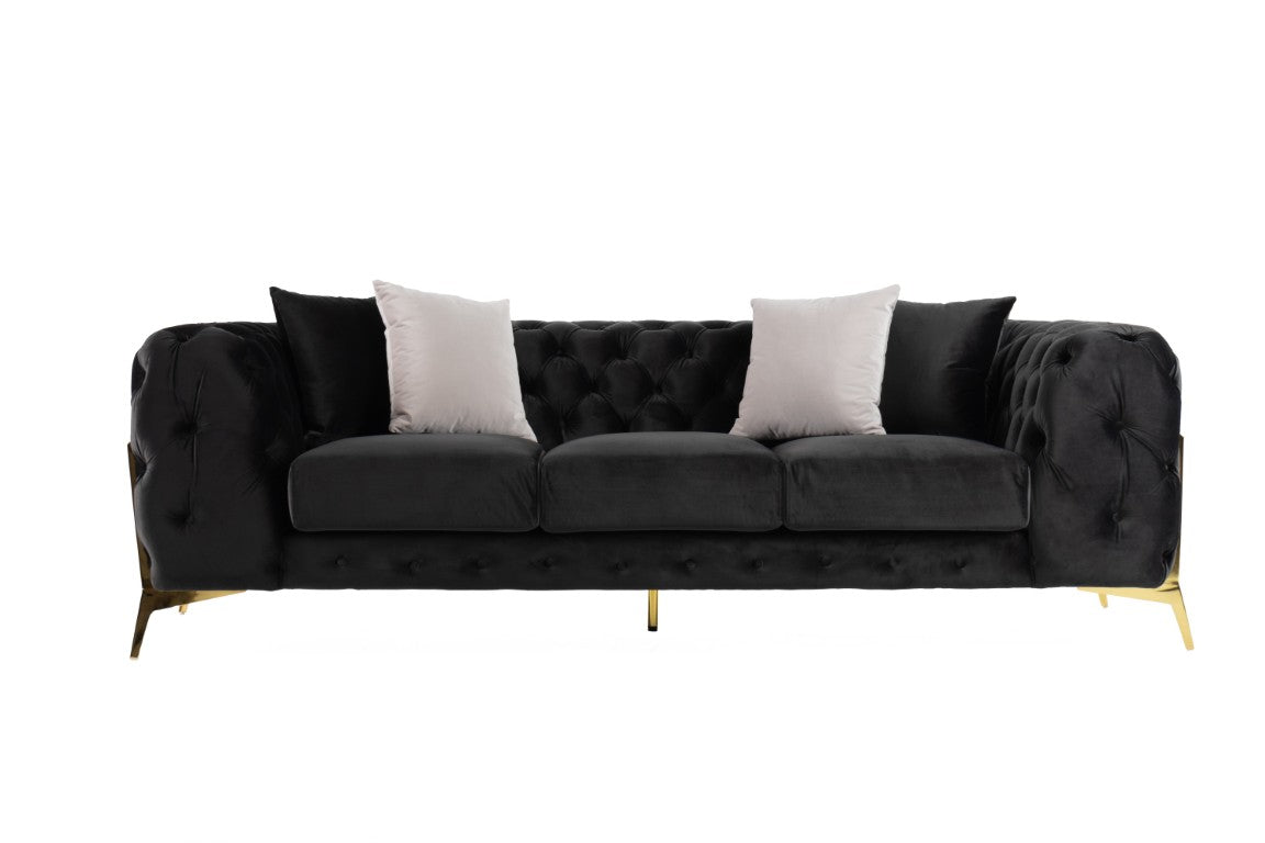 Sink into luxurious comfort with the Clarice transitional sofa—an elegant black velvet centerpiece that blends classic tufting with modern metal accents. Designed to seat up to three, this sofa combines supportive construction and plush upholstery for everyday living rooms or sophisticated lounge areas. Its clean square arms, button-tufted back, and gold metal legs create a refined silhouette that complements both contemporary and transitional interiors.