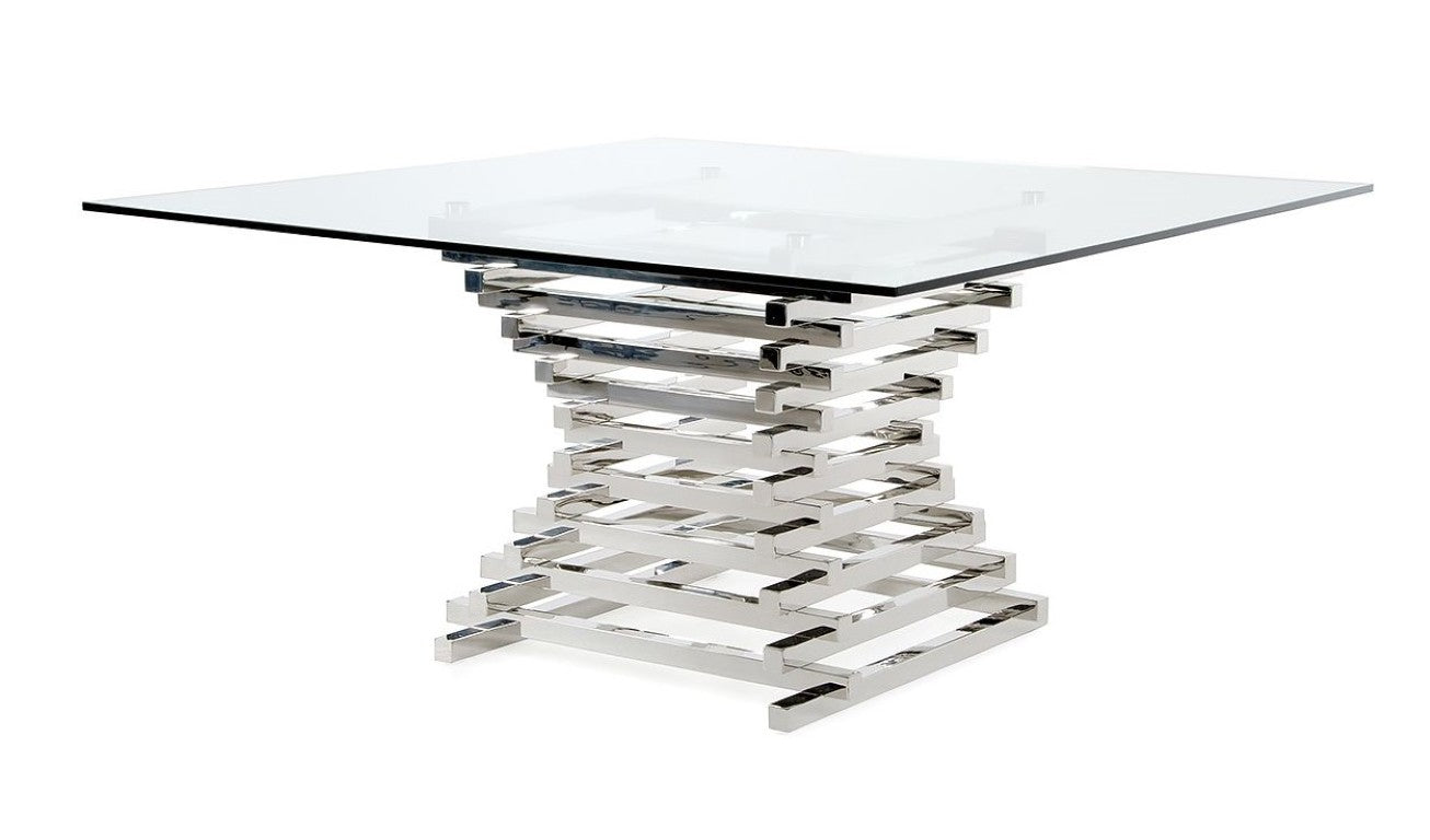 Elevate your dining space with the Crawford dining table — a striking modern centerpiece that blends minimalist geometry with durable materials. Its stacked, asymmetrical stainless-steel bars form an elegant hourglass base that supports a clear tempered glass top, creating an airy, upscale look that complements both neutral and bold seating choices.
