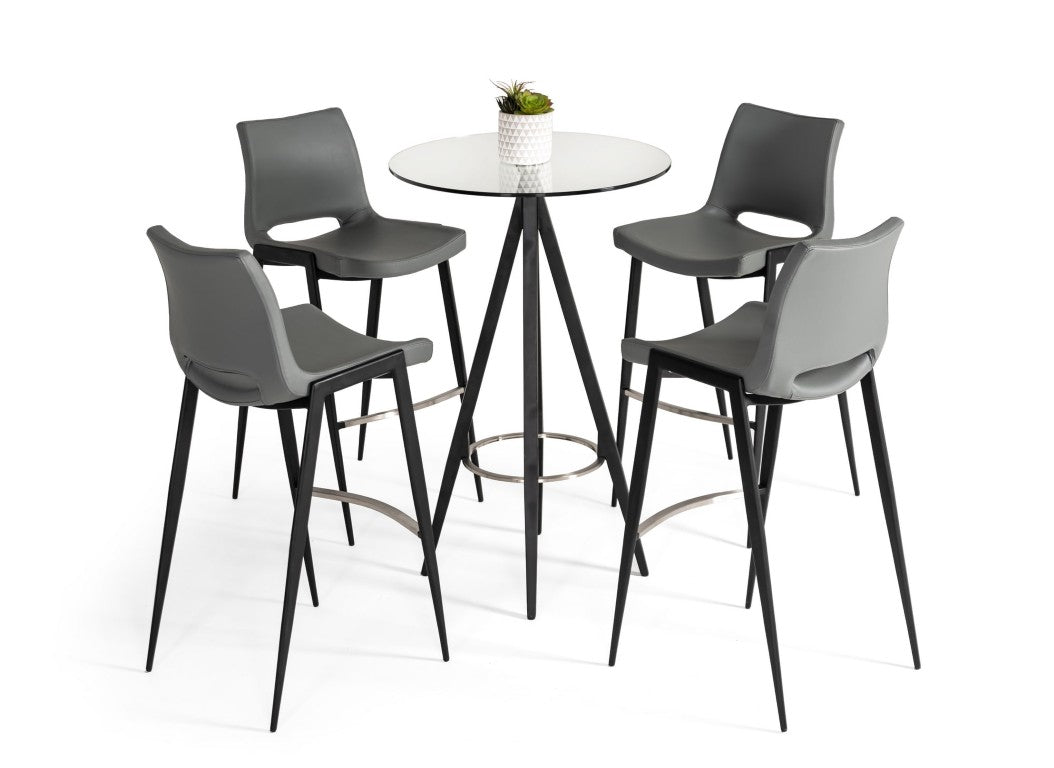 Sleek and modern, this bar table combines clear tempered glass with a black metal base and stainless footrest for a minimalist look that complements contemporary, industrial, and transitional interiors. Its compact round top and sturdy four-pronged support make it ideal for kitchens, home bars, bistros, or commercial settings where style and durability matter.