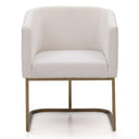 Elevate your dining space with the Yukon — a modern chair that balances contemporary clean lines with warm, vintage-inspired accents. Upholstered in soft white fabric and supported by a distinctive U-shaped antique brass finished stainless steel base, this chair offers both style and stability for everyday meals or special gatherings. Its streamlined silhouette and thoughtful proportions make it an ideal complement to modern, transitional, or mid-century dining rooms.