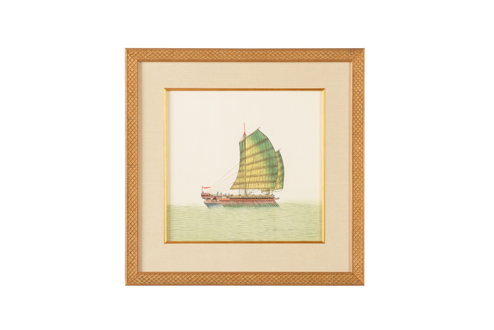 Bring tranquil maritime charm to your space with this hand-painted watercolor on silk depicting two Chinese junks. The piece combines delicate brushwork and subtle color on silk with a refined gold frame and protective glass, making it a ready-to-hang artwork that suits traditional and coastal interiors alike.
