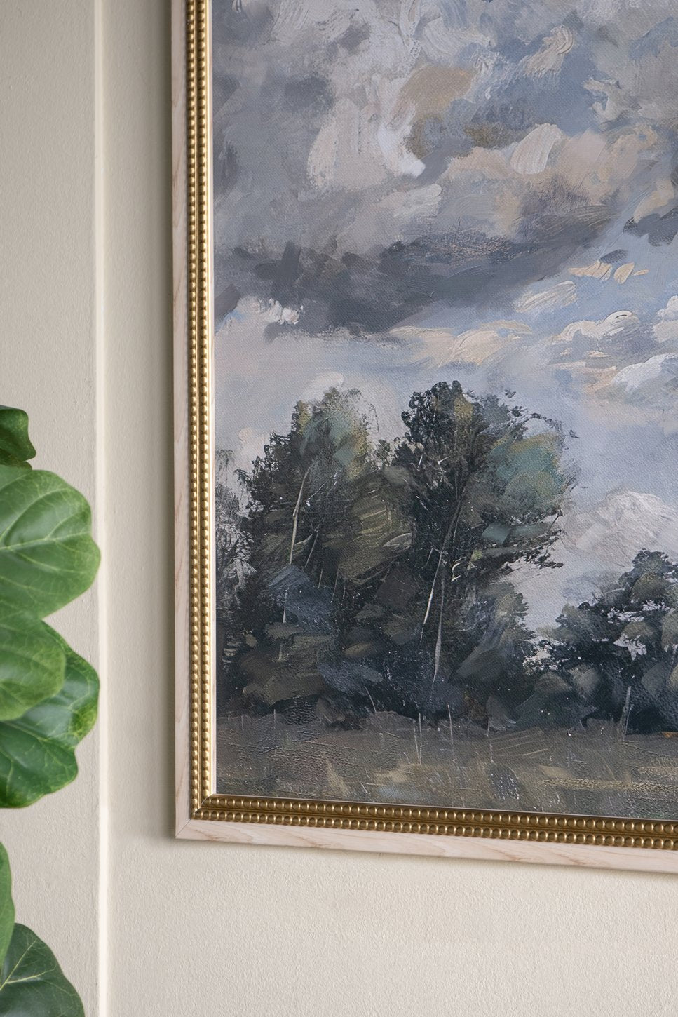 - Capturing the serene beauty of a sprawling countryside, this canvas art features white, fluffy clouds, a tranquil blue sky, and scattered green trees, all framed in a light brown border.