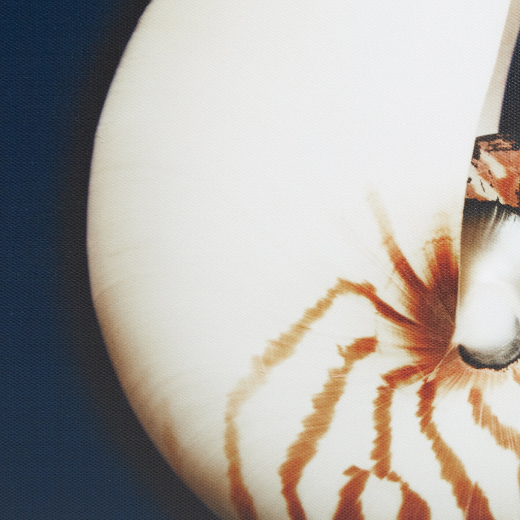 - Featured artwork: Four coordinated canvas panels depicting realistic seashells on a lush navy background for bold contrast and visual depth.
