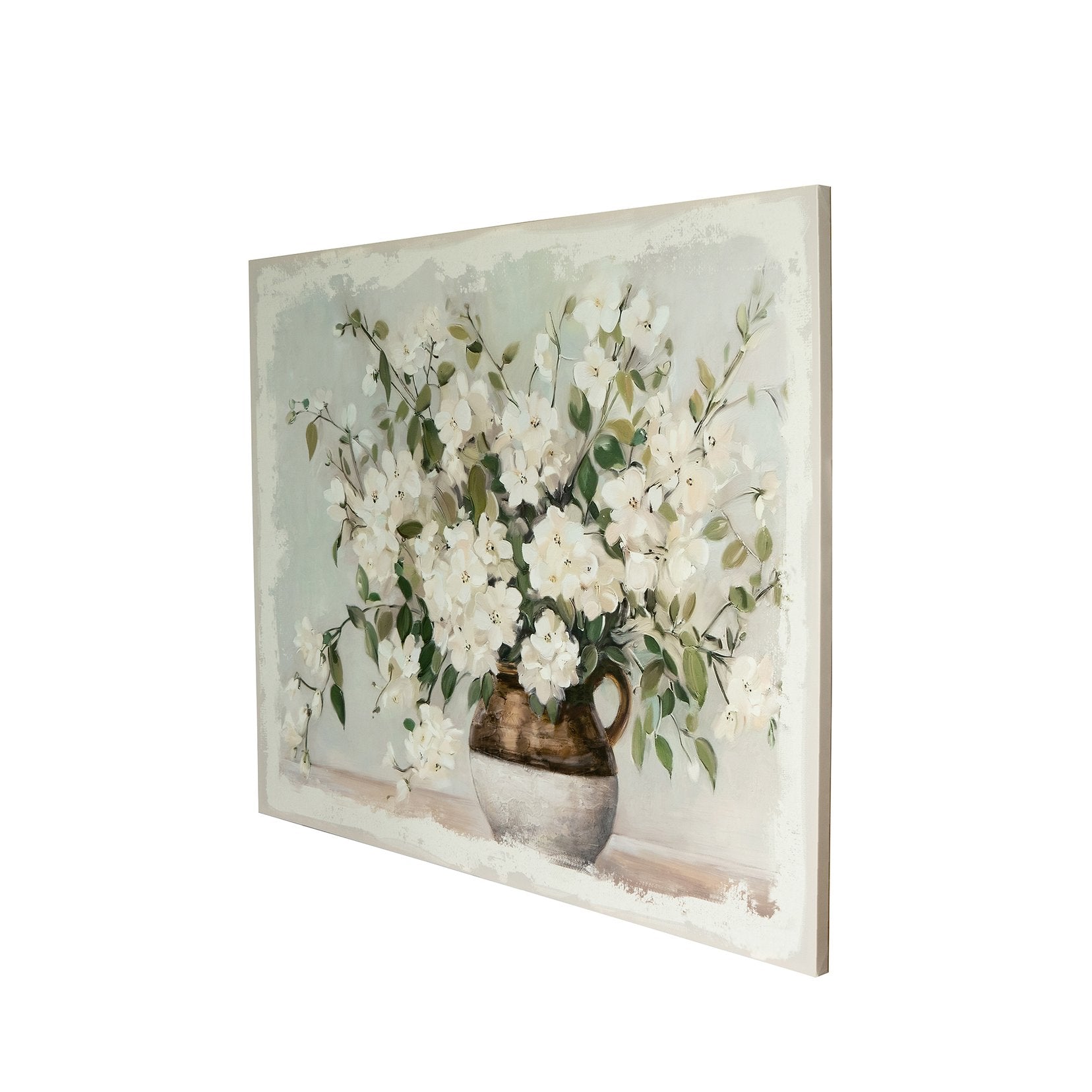 - Transforming the serene beauty of nature into a romantic work of art, this canvas print showcases a collection of elegant white blossoms, accented with shades of green and earthy brown.