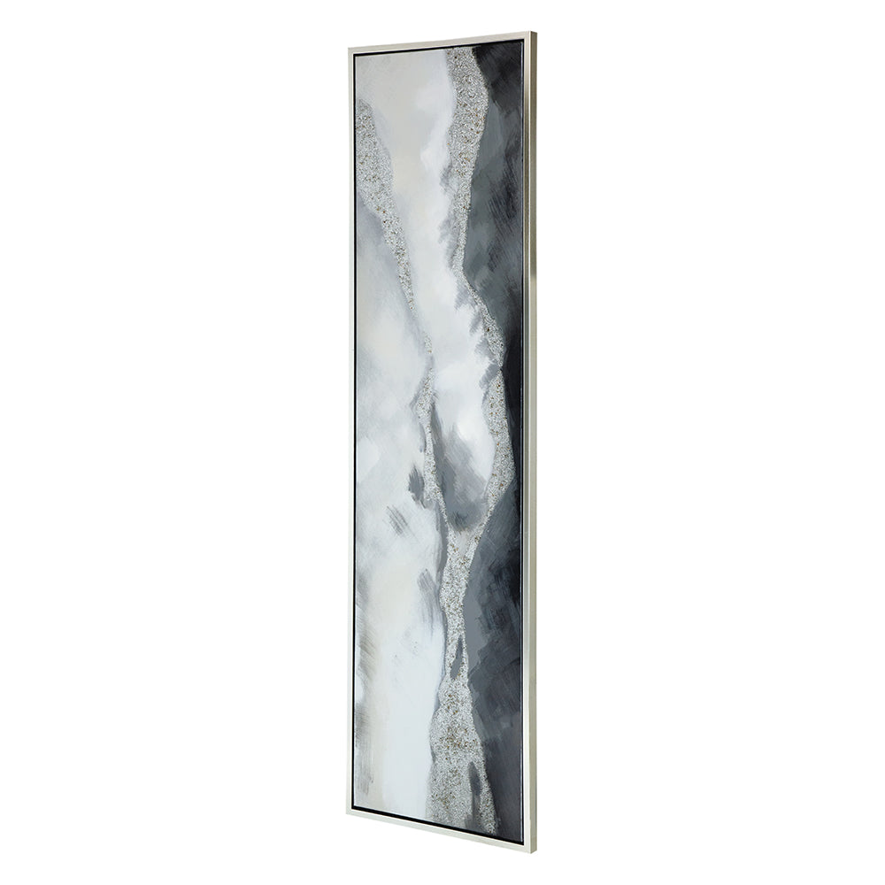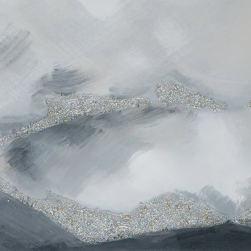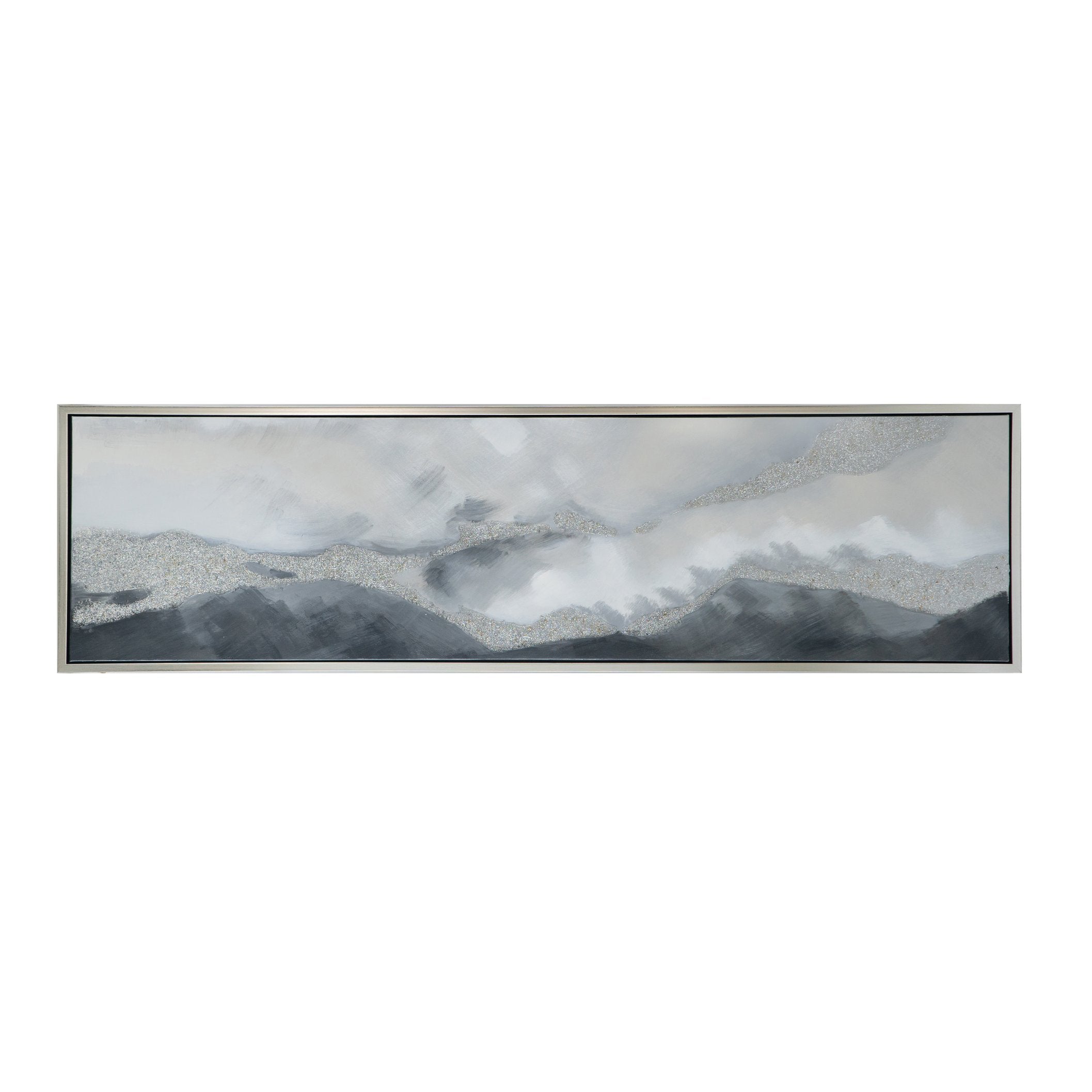 Bring a serene, textured landscape into your home with this hand-painted oil wall art that captures rugged mountaintops rising through morning clouds. Soft gray tones transition from light to dark to create depth and layered perspective, making it a calming focal point for living rooms, bedrooms, dining areas, offices, or entryways. The tactile oil paint surface adds subtle texture and an artisanal feel that changes with viewing angle and light.