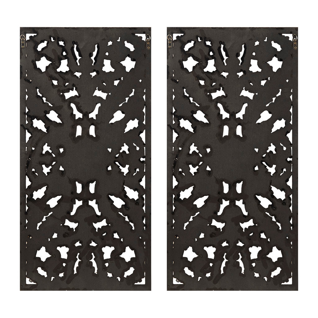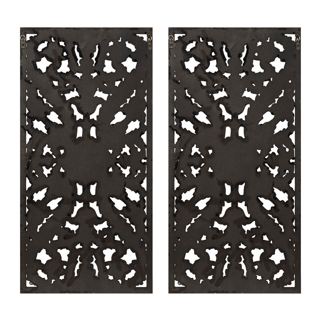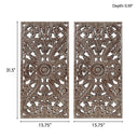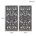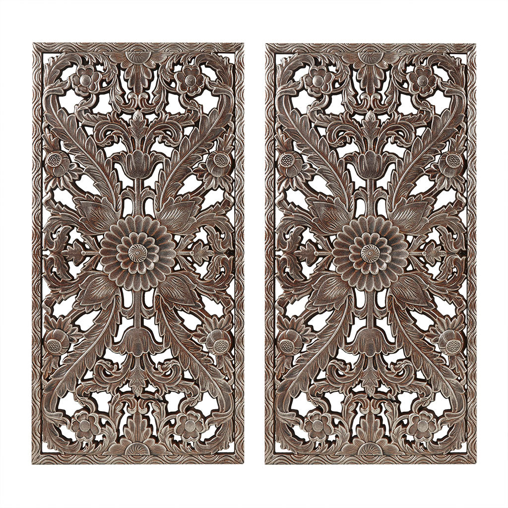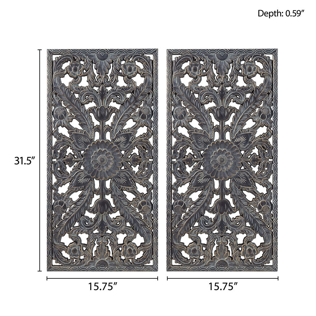 Elevate your interior with this elegant 2-piece carved wood wall decor set that blends global botanical artistry with an antique metallic finish. Each panel offers rich texture and depth from expertly carved detailing on durable MDF, creating a refined focal point for living rooms, dining areas, entryways, or halls. The versatile antique silver and bronze finish brings subtle sheen and character, while pre-installed D-ring hangers make installation quick and customizable—hang panels side-by-side for a formal look or stagger them for a modern display.
