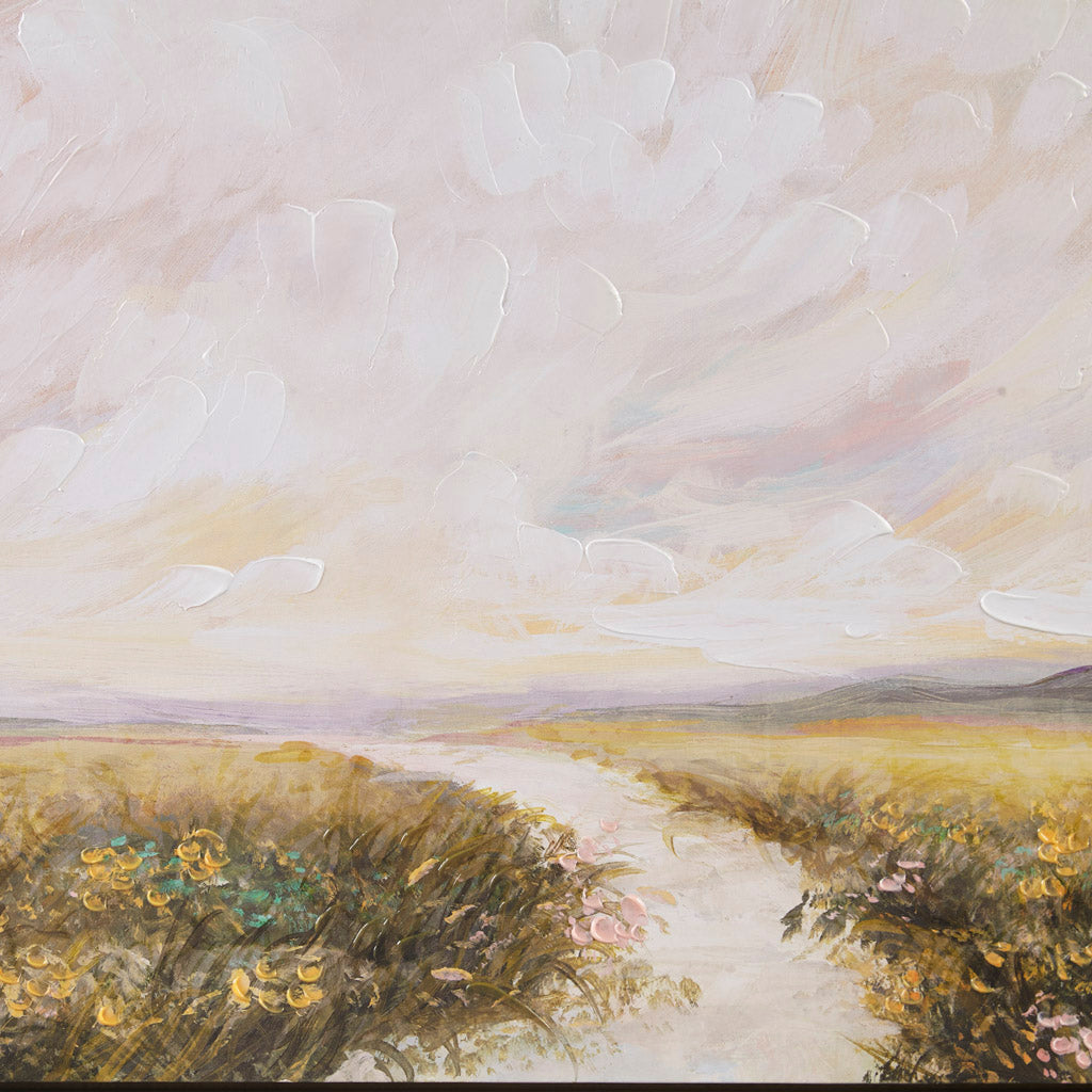Bring a sense of calm and refined texture to your walls with this hand-embellished framed canvas landscape by Katija Bjelajac for Madison Park. Rendered in soft, subdued multi-colors with painterly strokes and subtle dimensional embellishments, this artwork blends traditional landscape composition with contemporary finish—ideal for living rooms, bedrooms, hallways, or office spaces seeking a serene focal point. The piece arrives ready to hang in a warm brown gallery frame and is designed for easy upkeep.