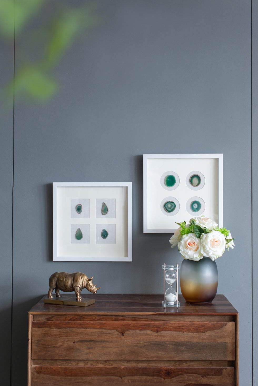 - White background and frame provide high contrast to showcase the agates and suit minimalist interiors