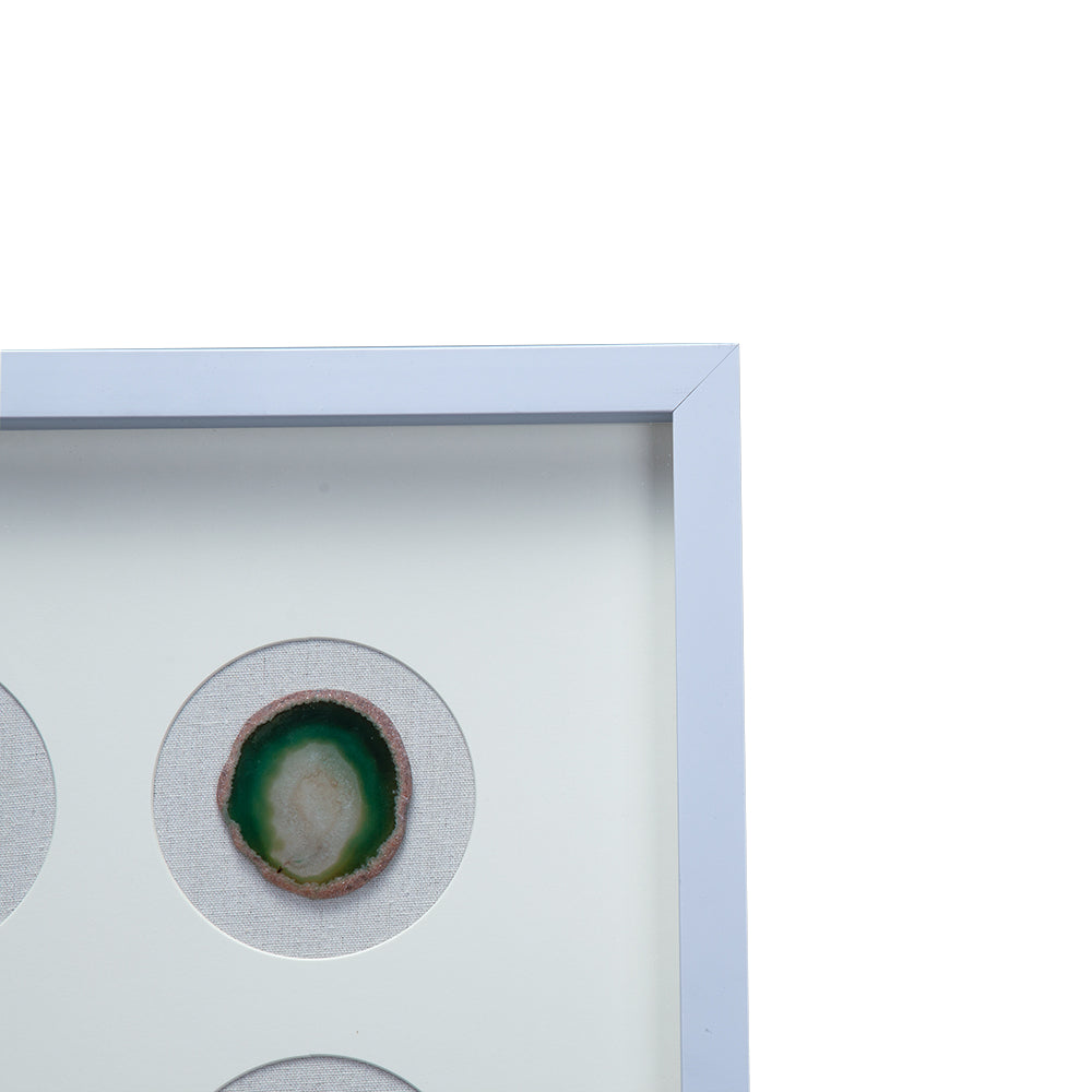 - The contrast of the agates against the white background frame make this wall decor the perfect addition for a minimalist office or modern art installment.