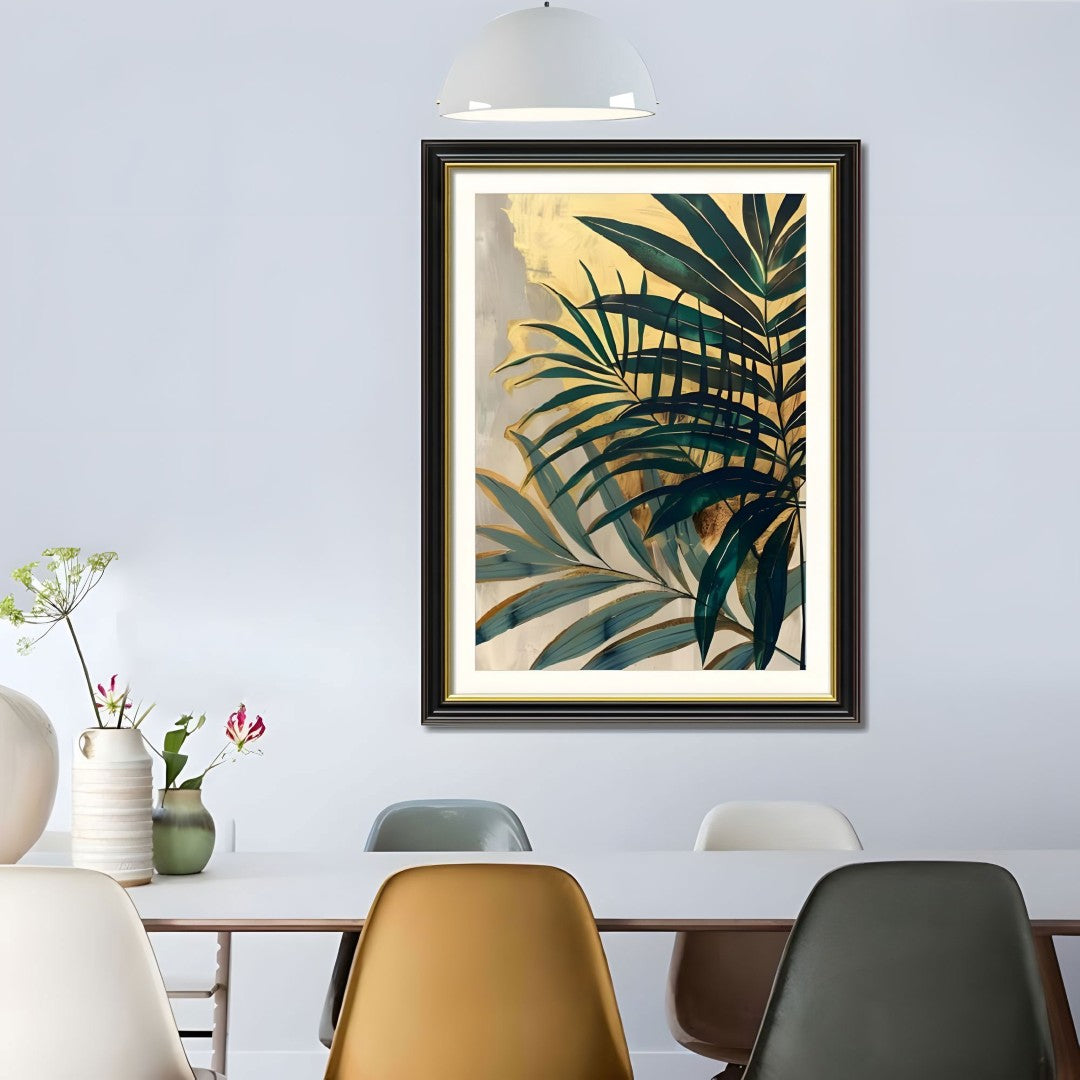 - Set includes: Two framed canvas prints featuring tropical palm-leaf designs in golden, green, and pink tones