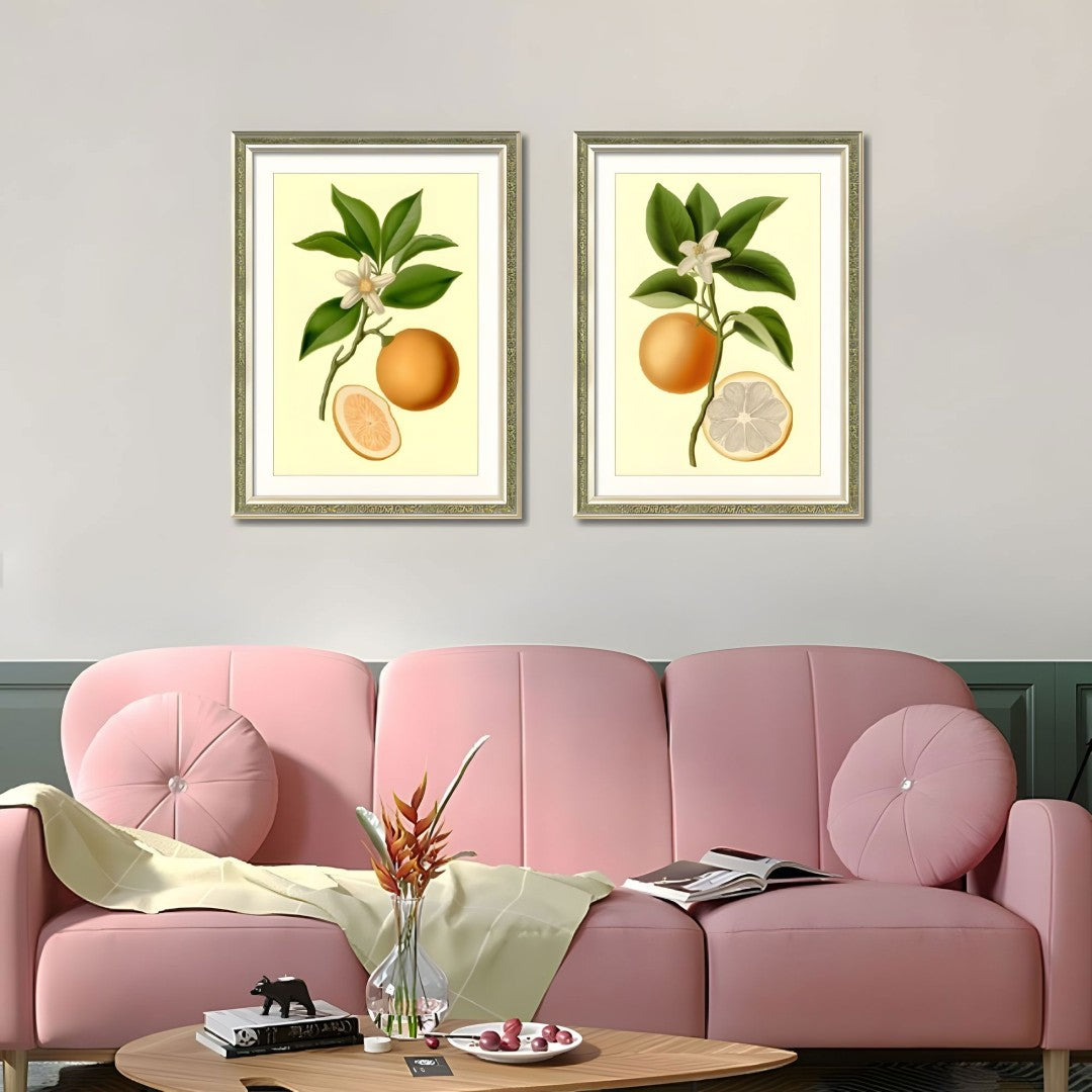 - Set of 2 coordinated prints: Matching botanical orange fruit designs that create a cohesive focal point for kitchens, dining rooms, or casual living spaces.