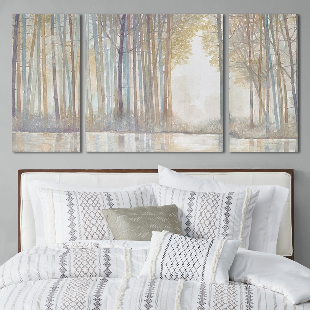 Bring a calm, reflective atmosphere to any room with the Forest Reflections triptych by Norman Wyatt Jr. This three-piece canvas set layers cool, natural hues across a cohesive forest-and-pond scene that draws the eye and creates visual depth. Finished with a subtle gel coating for added texture and a light gloss, the set is designed for easy hanging and low-maintenance care—ideal for living rooms, bedrooms, or entryways seeking a serene focal point.