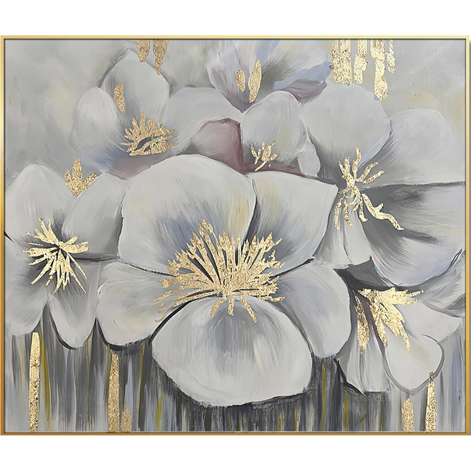 Bring refined elegance and artisanal charm to your space with this hand-painted canvas featuring vibrant orchids set against a white and gold palette. The richly textured oil paint, gold foil accents, and a luxurious gold frame combine to create a striking focal point that suits living rooms, bedrooms, hallways, or entryways. Each piece is individually painted, so subtle variations make your artwork truly one-of-a-kind.