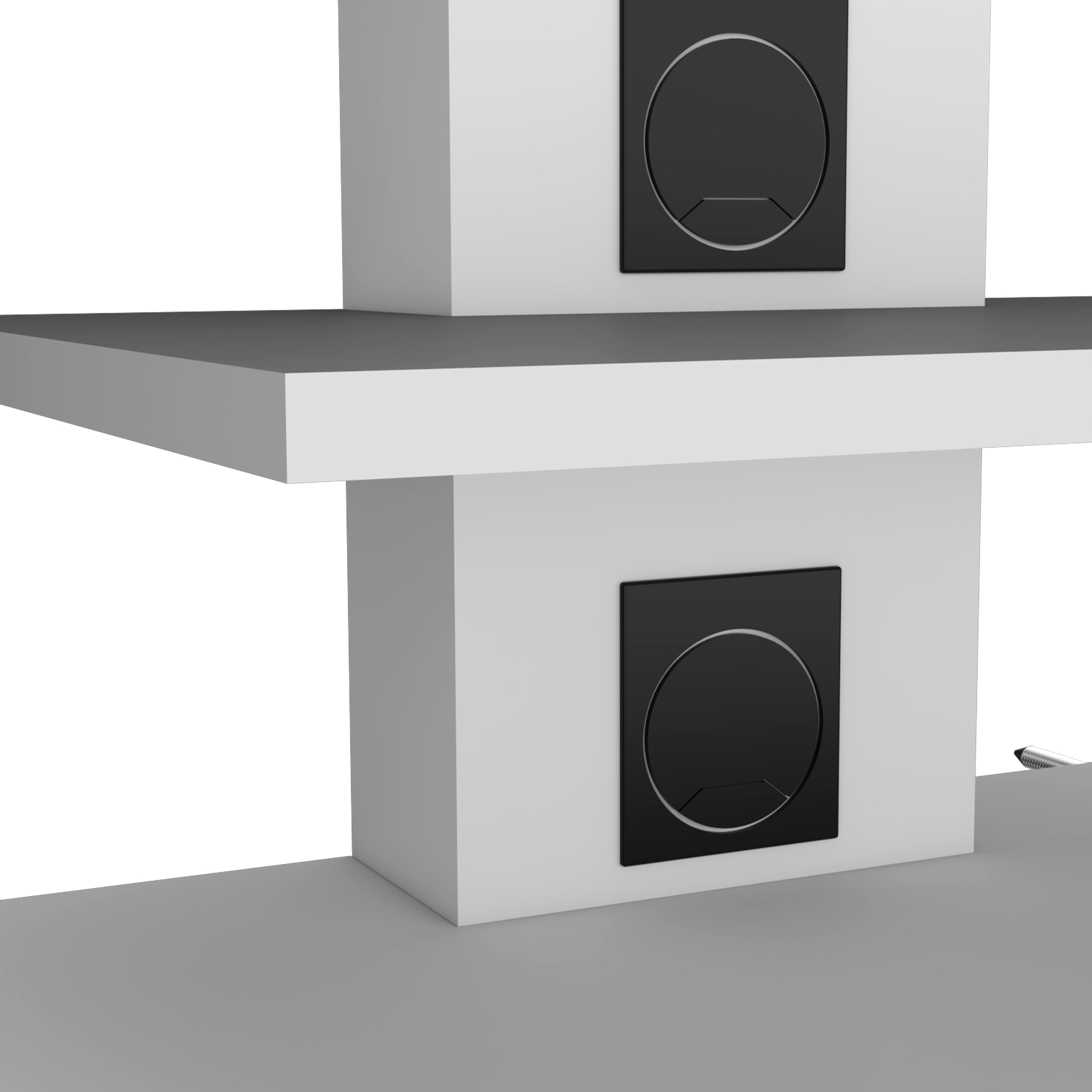 - Each shelf features two holes with covers, keeping cords organized and discreet