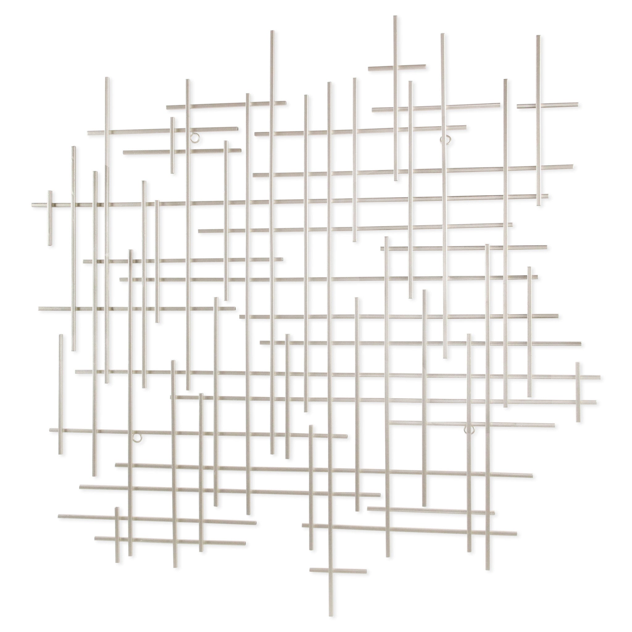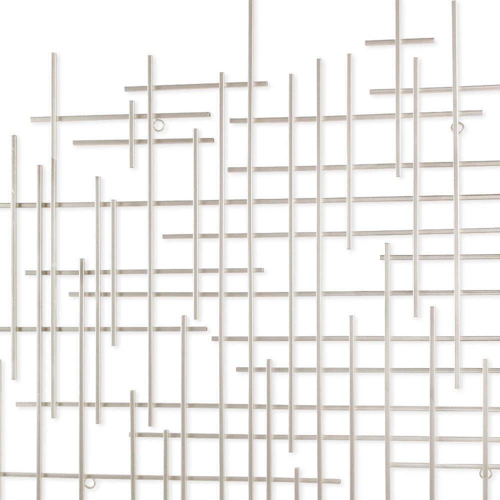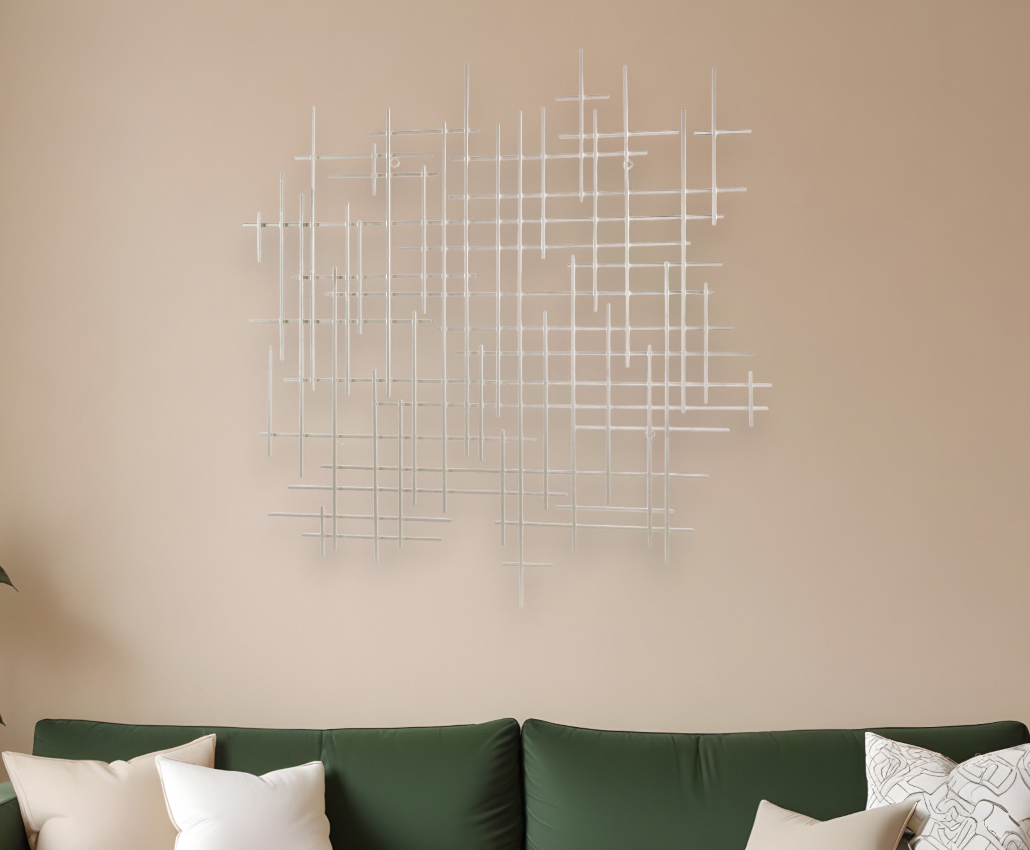 - Features geometric overlapping metal strips to create a modern abstract grid design.