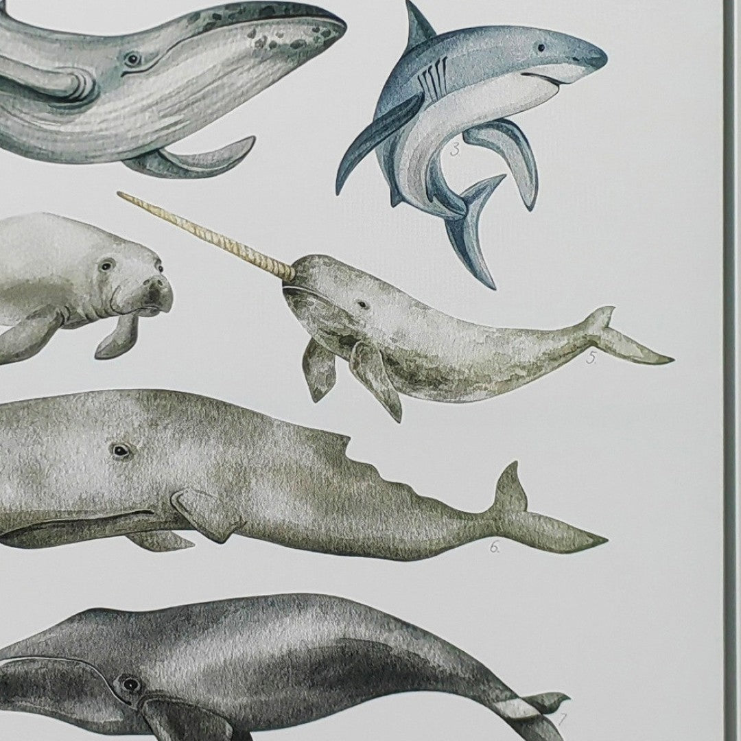 - Coastal / Nautical sea life wall art that includes a whale, shark, narwhal, dolphin, and more!
