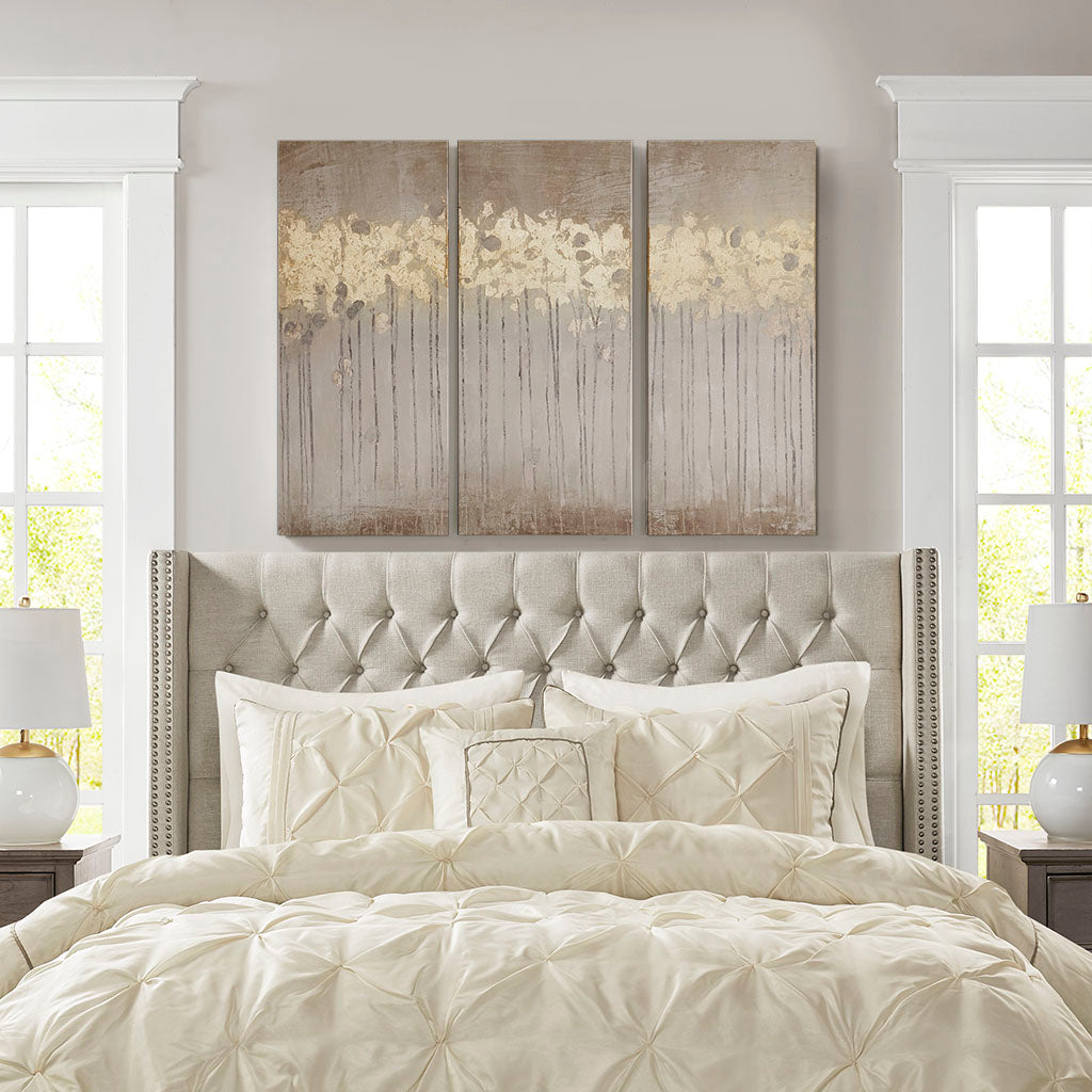 Bring contemporary elegance and subtle glamour to your walls with this three-piece abstract canvas set by artist Delsie Walters. Neutral taupe tones and soft forest-inspired forms are highlighted with metallic gold foil and a protective gel coat, creating depth, texture, and a lasting glossy finish that complements modern and transitional interiors.