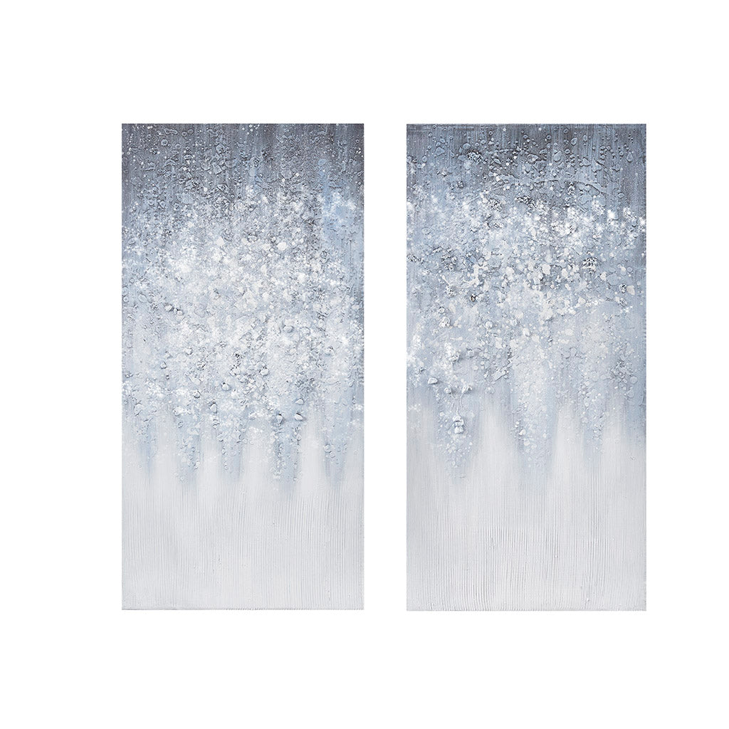 Add a touch of modern glamour to any room with this two-piece canvas art set. Each panel features a heavy-textured abstract winter design in cool blue and white tones, enhanced with hand-applied embellishments and glitter for subtle shine. The finished canvases create a cohesive focal point when hung together above a sofa, bed, or entryway.