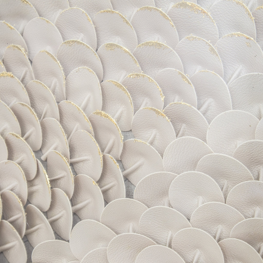 - Feature #1: Laeather Pettals Are Layered Into Abstract Pappern. Edges Of Some Of The Pettels Are Accented With Golden Paint. Framed And Covered With Glass.