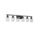 Brighten your bathroom or dressing area with this sleek, modern 6-light vanity fixture that blends contemporary black ironwork with clear glass shades for crisp, even illumination. Designed for hard-wired wall mounting, it delivers both task-ready lighting and a stylish focal point above mirrors or vanities. Note: bulbs are not included so you can choose the color temperature and brightness that best fits your space.