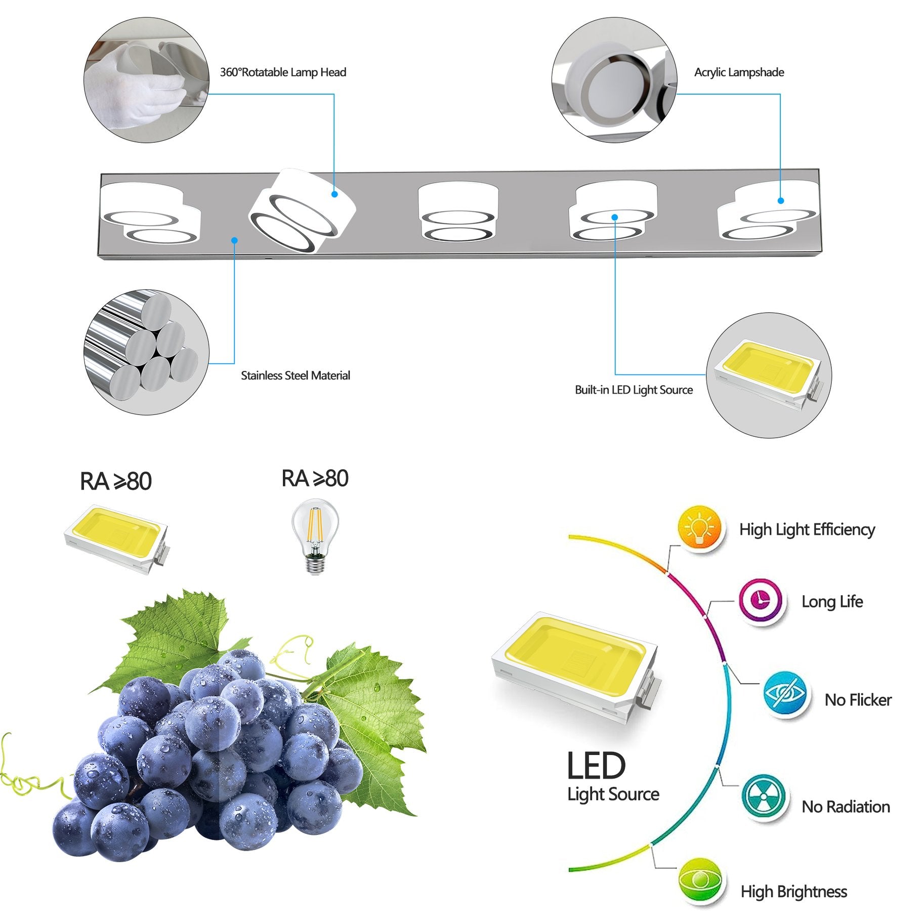 - Versatile Use: Ideal for bathrooms, dressing areas, powder rooms, and other interior spaces where bright, focused lighting is needed