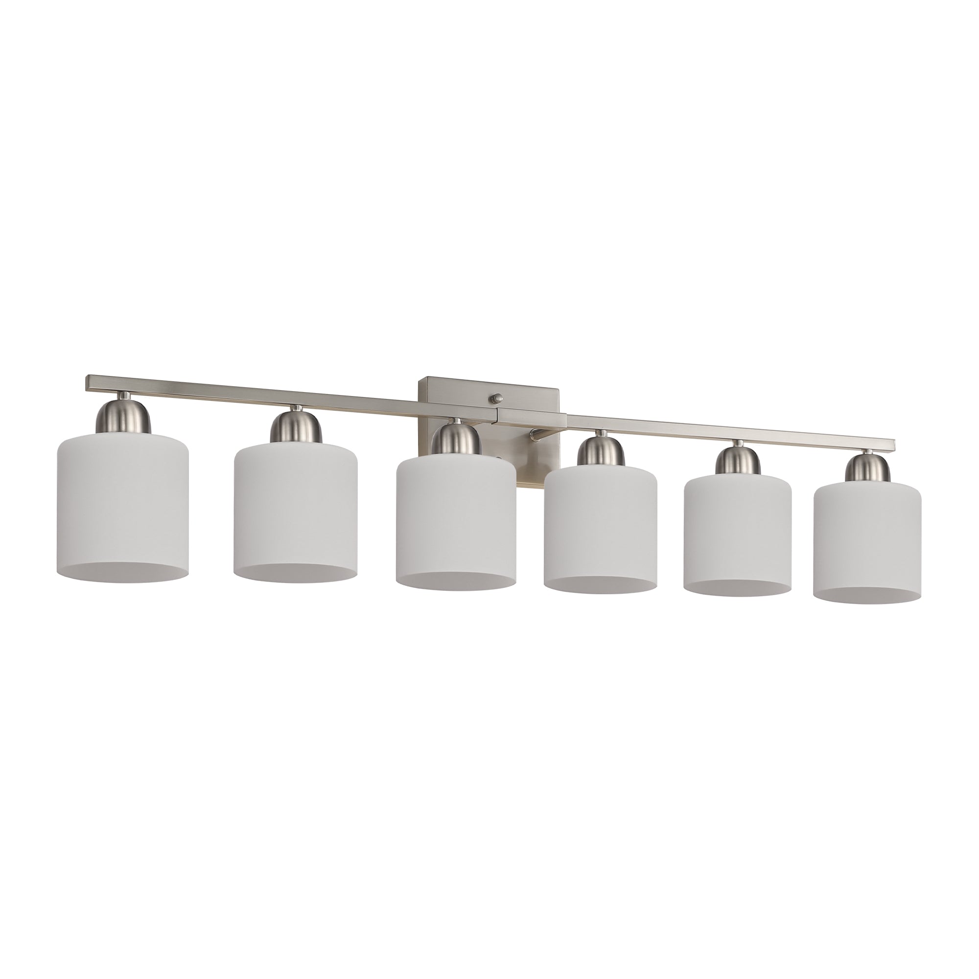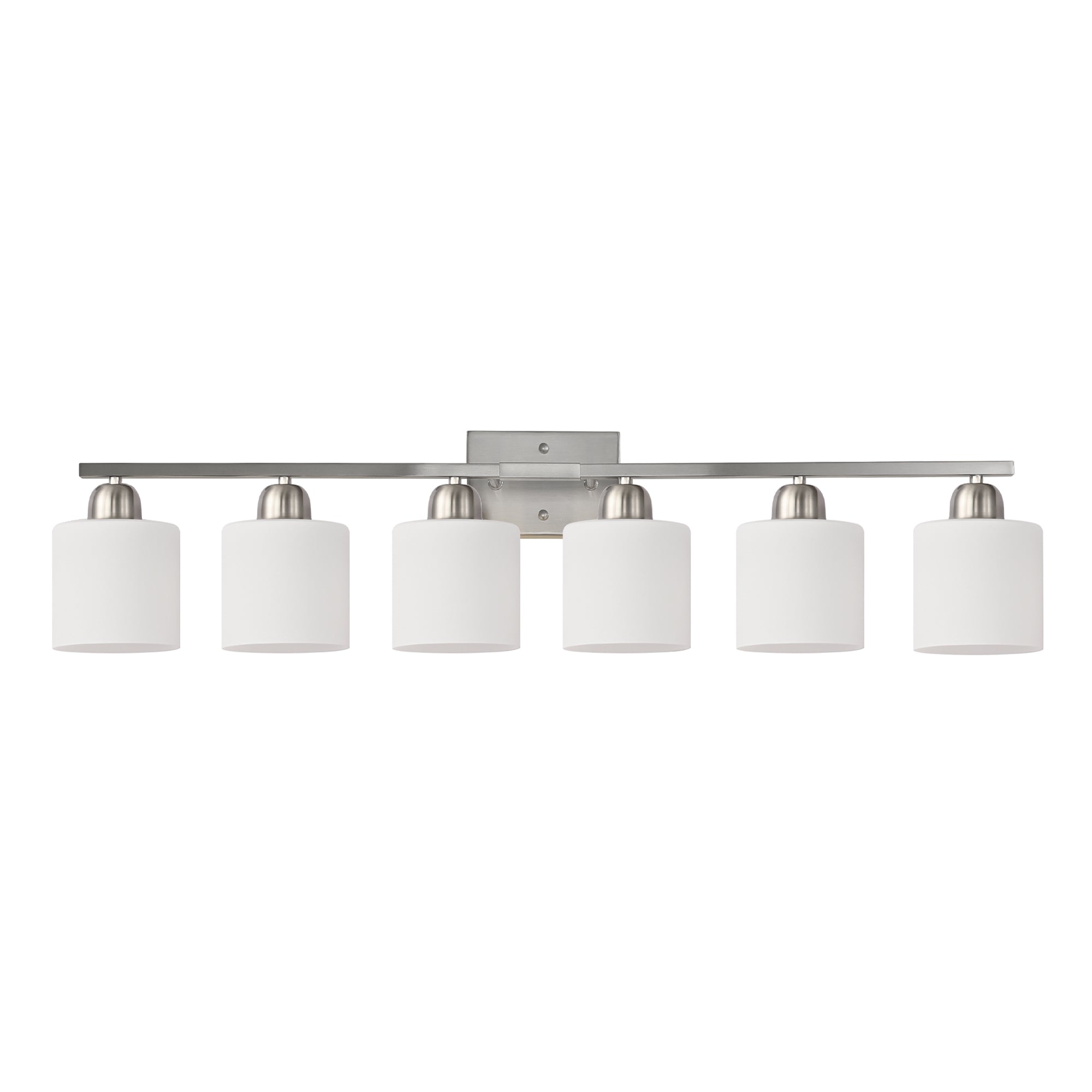 Bring timeless, versatile lighting to your bathroom or vanity area with this elegant 6-light wall sconce. Finished in nickel with milky white glass shades, the fixture delivers soft, flattering illumination ideal for grooming, makeup, or ambient bathroom light. Its durable metal construction and heat-resistant E26 sockets accept a variety of bulb types so you can tailor brightness and color temperature to your space.