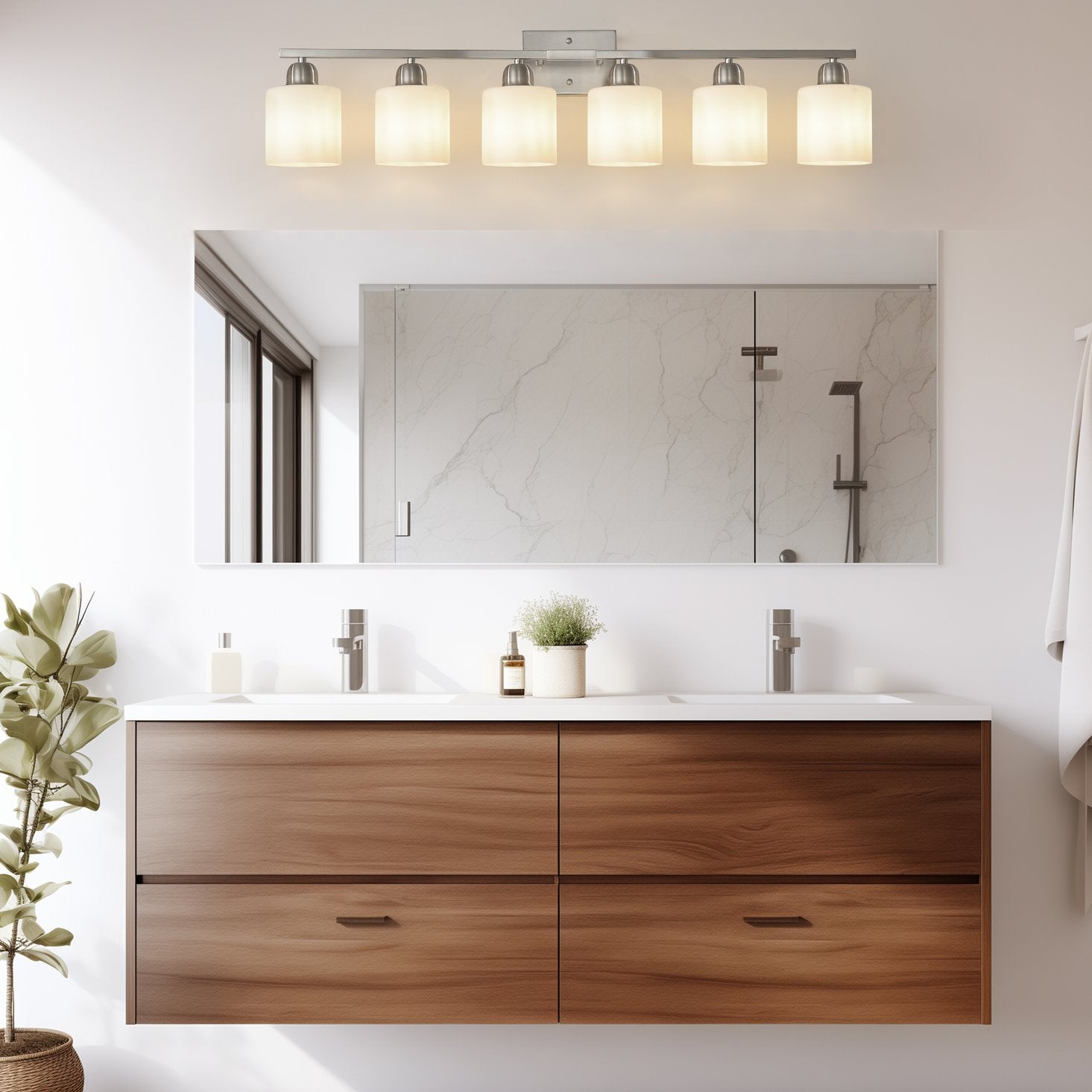 - Robust construction:Crafted from metal, our 6 Light Nickel Bathroom Vanity Fixture ensures durability and color fading. It is paired with a Milky White Glass Shade, offering soft and diffused lighting effect
