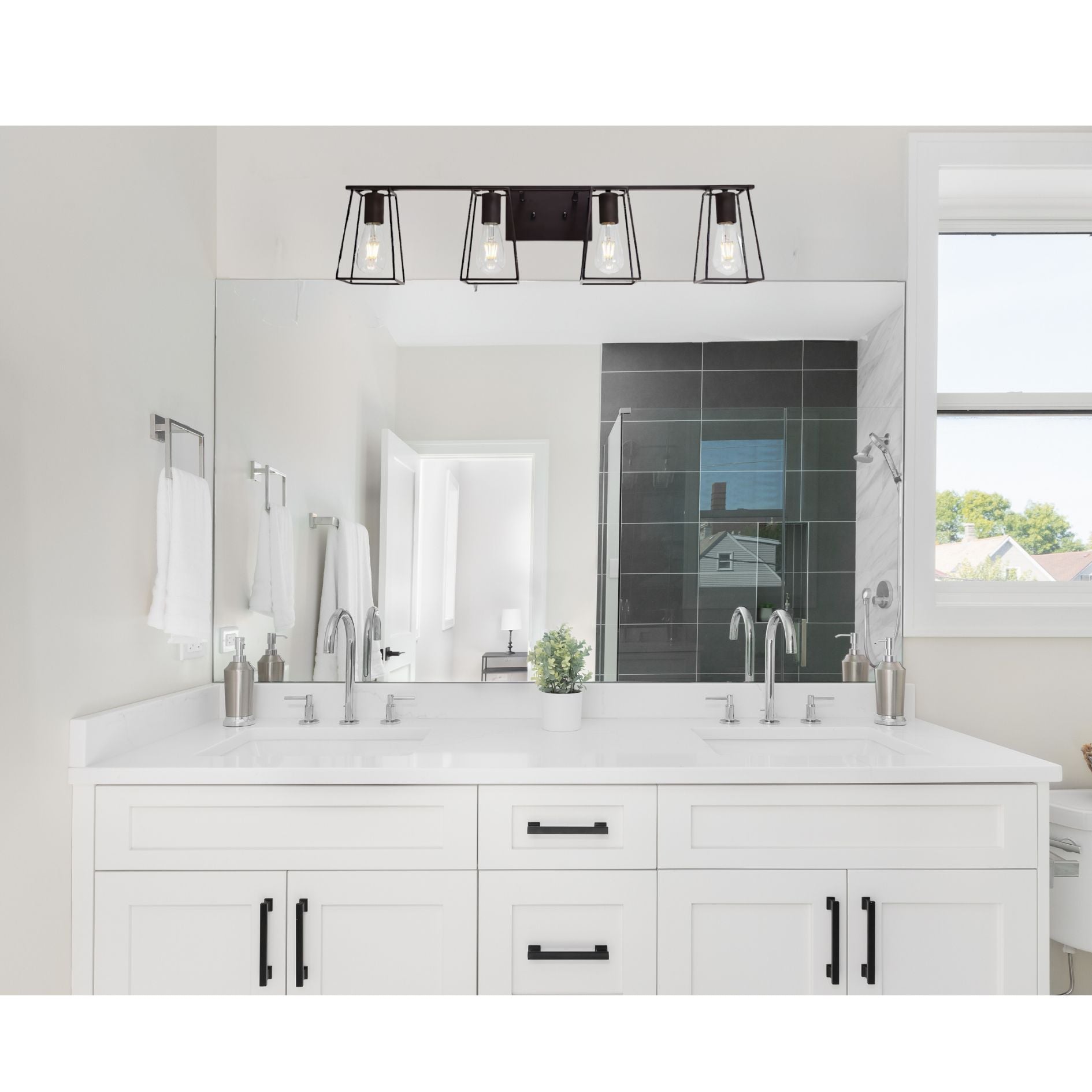 Give your bathroom or living space an instant style upgrade with this industrial-vintage 4-light wall sconce in oil-rubbed bronze. The open metal-cage design exposes classic candelabra-style bulbs for a warm, atmospheric glow while the sturdy metal construction and versatile mounting make it suitable for a variety of interior applications—from vanities and hallways to restaurants and retail spaces.