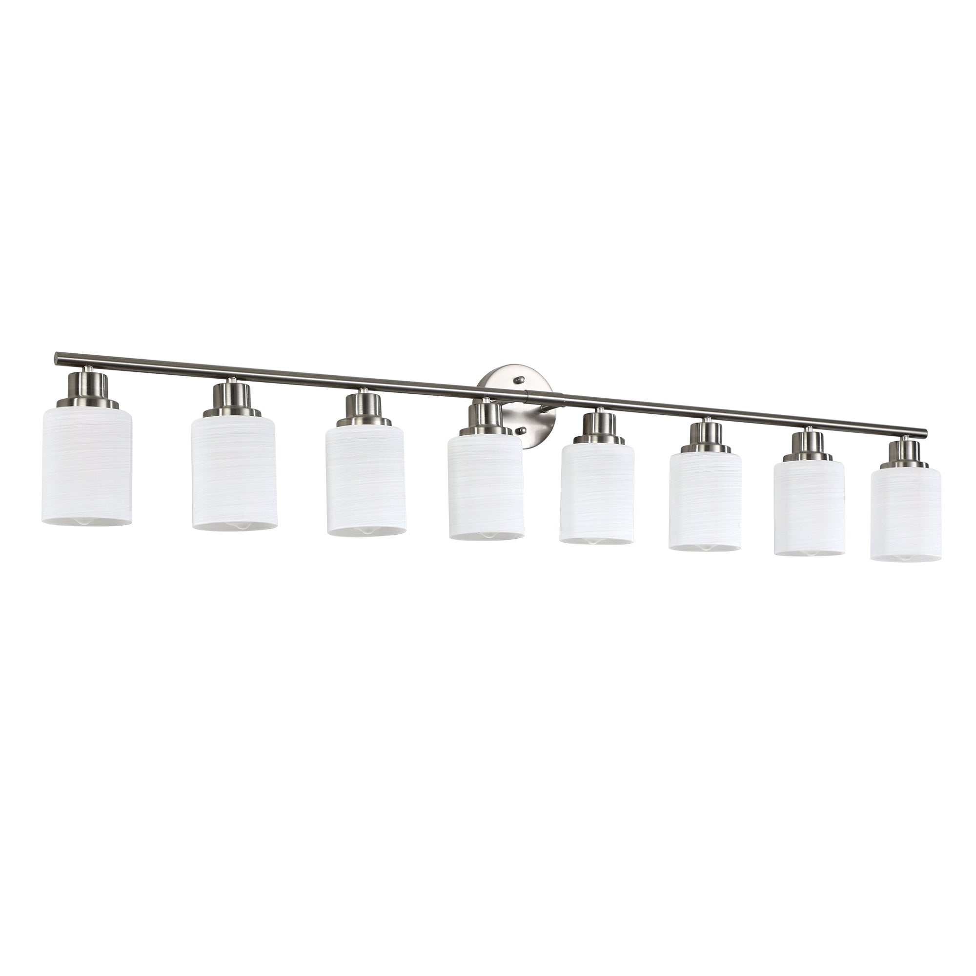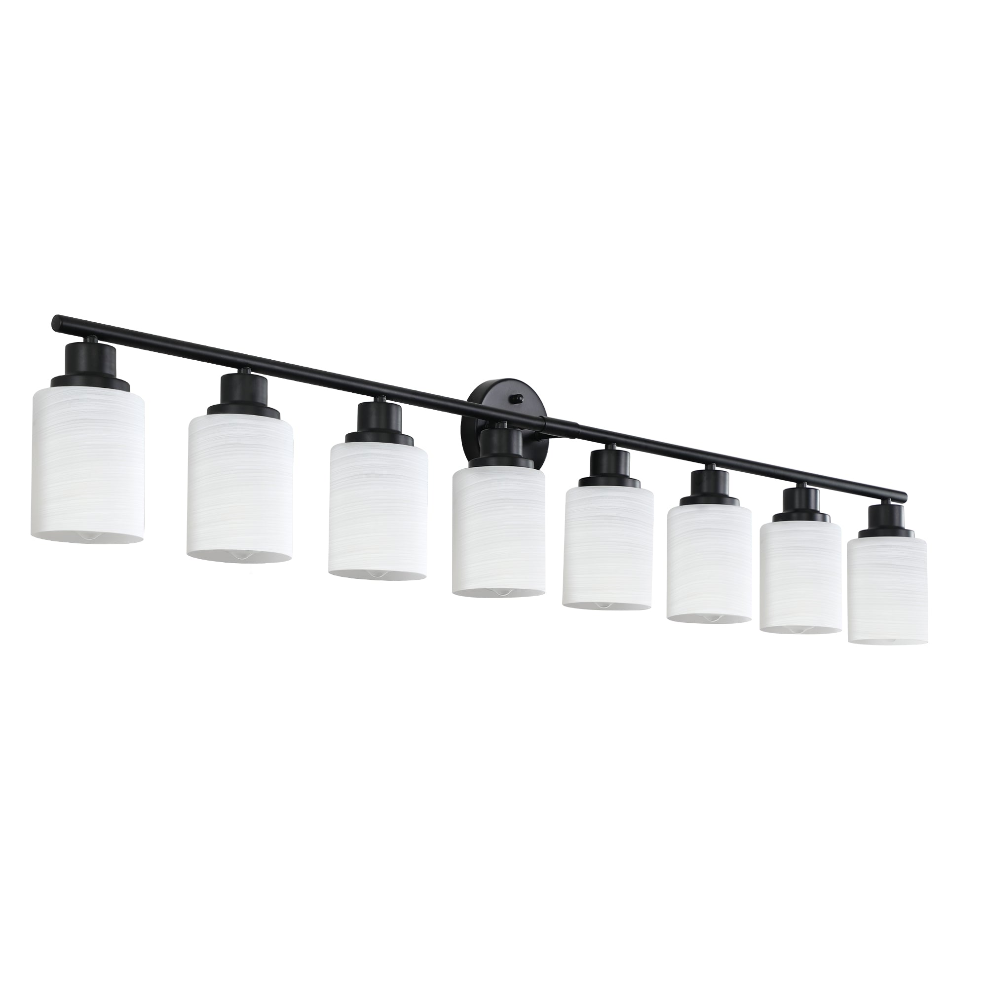 Bring studio-quality illumination and modern industrial style to your bathroom, dressing room, or bedroom with this sleek 8-light vanity wall sconce. Designed to deliver flattering, even light for grooming and makeup while making a bold decorative statement, the fixture pairs frosted white glass shades with a matte black iron frame for a contemporary look that complements many decors. Hard-wired for a clean installation, it accepts standard E26 bulbs (not included) so you can choose the color temperature that best fits your space.