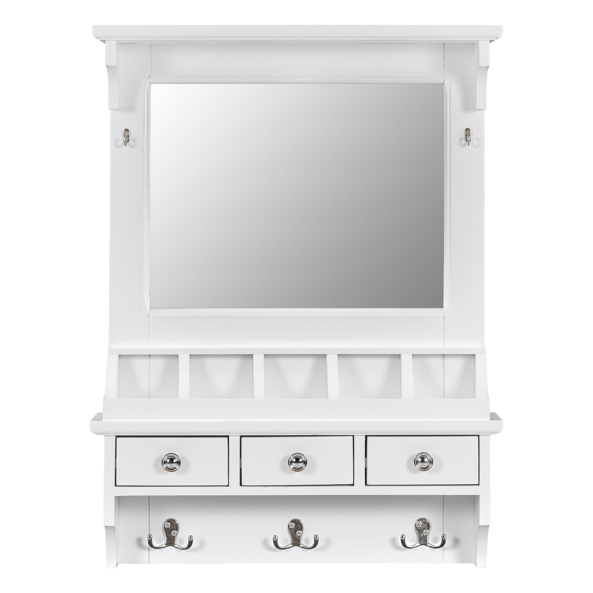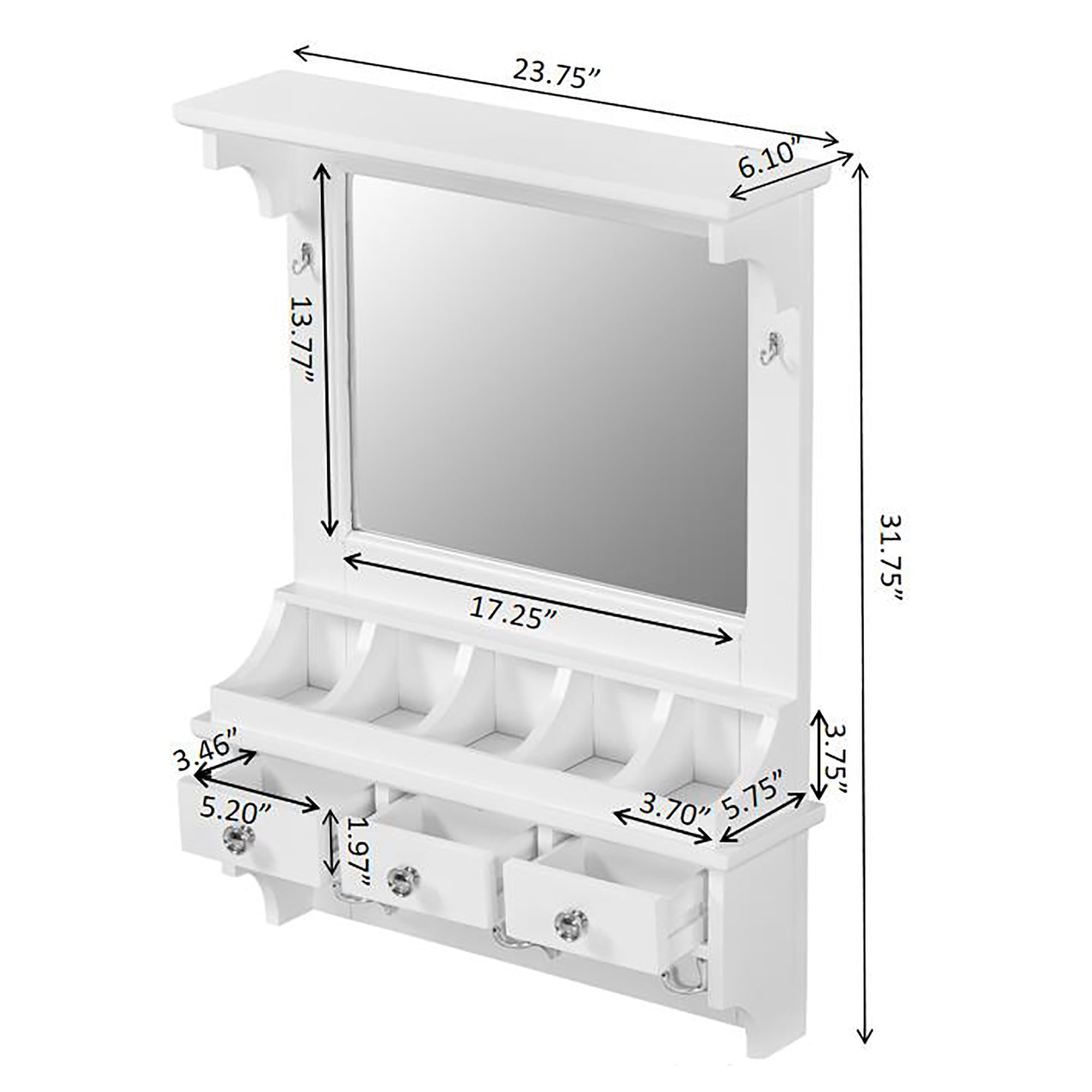 Bring practical organization and a sleek, modern look to tight spaces with this wall-mounted floating vanity and storage organizer. Designed for small rooms, it combines a large high-definition mirror, multiple storage drawers, pockets and hooks to keep cosmetics, accessories and daily essentials neat and accessible while freeing up countertop and floor space.