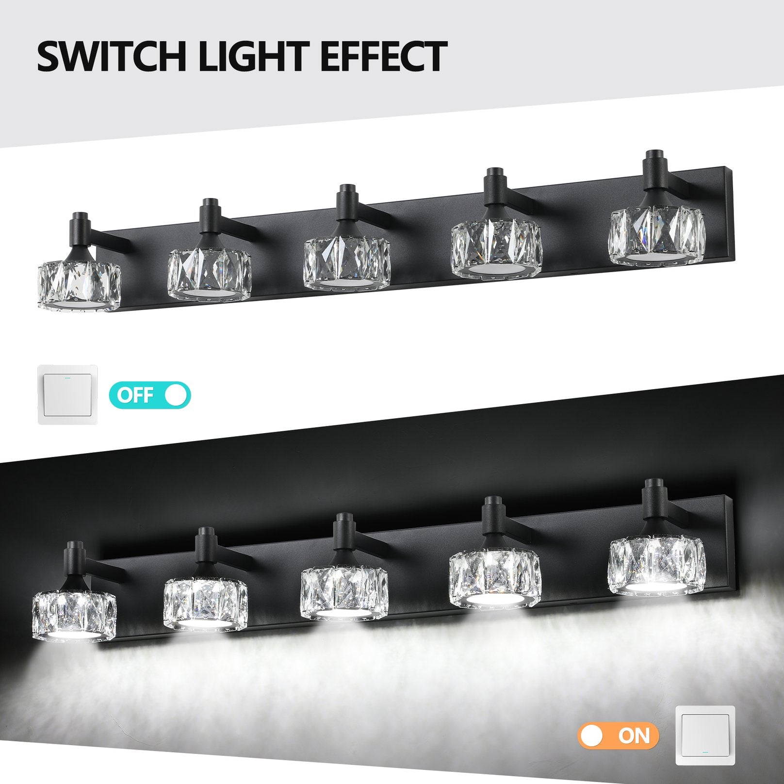 Elevate your bathroom or dressing area with this contemporary 5-light matte black vanity fixture, which blends sleek iron construction, sparkling crystal glass shades, and energy-efficient LED performance. Designed for modern homes, the fixture provides bright, high-CRI illumination and a refined silhouette that complements minimalist and transitional decor alike—ideal for grooming, makeup, and ambient lighting.