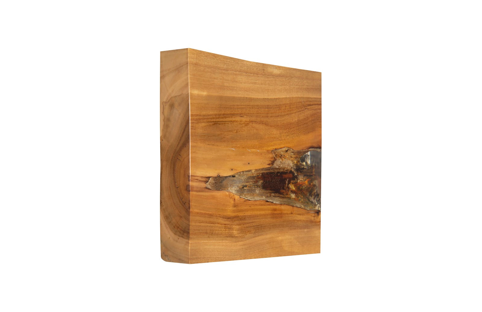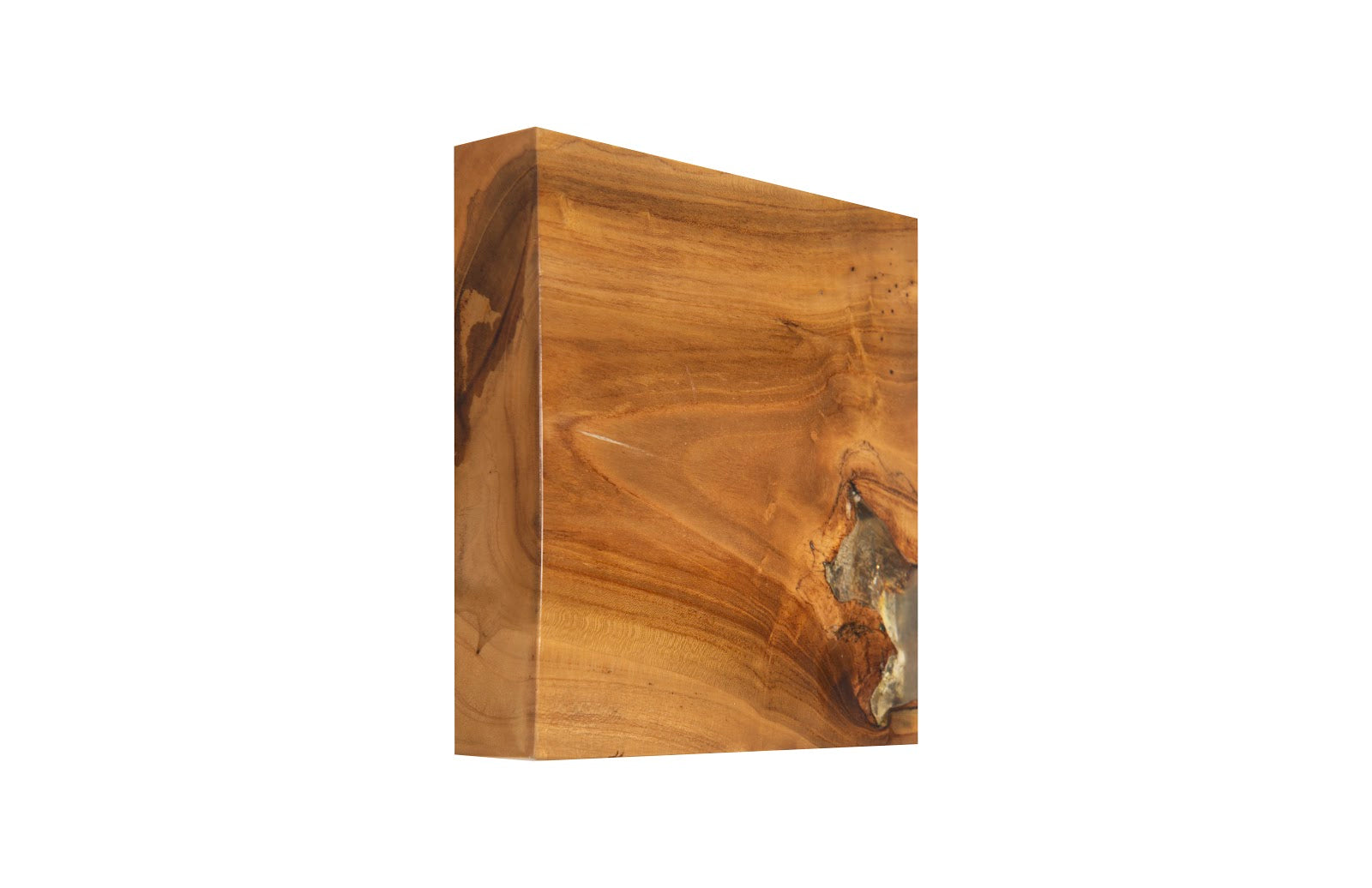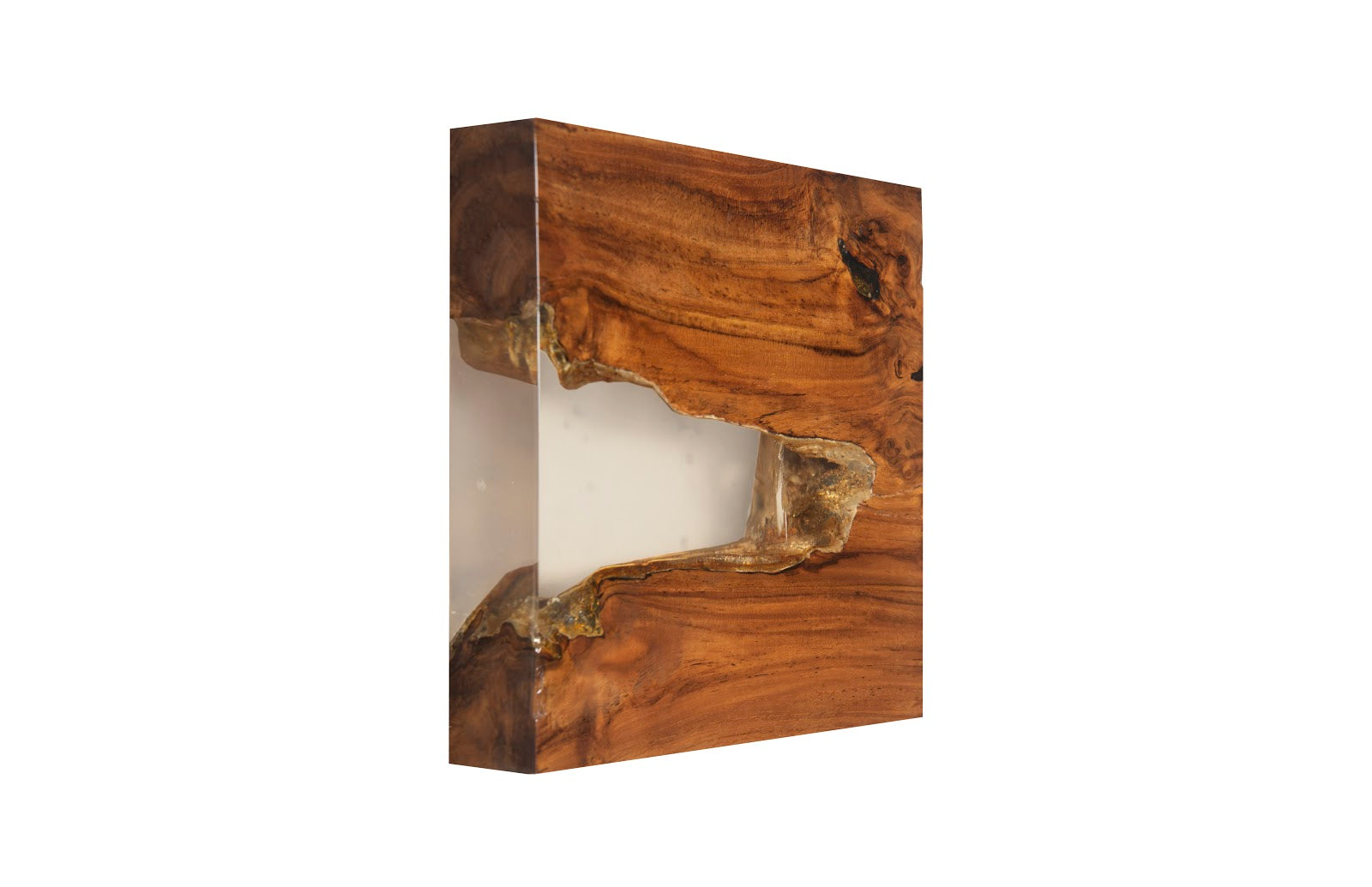 A marriage of unlikely materials creates an eye-catching juxtaposition. Resin complements wood while defining the simple shape of the wall tiles. Made from teak wood with resin and crushed glass filled cracks.