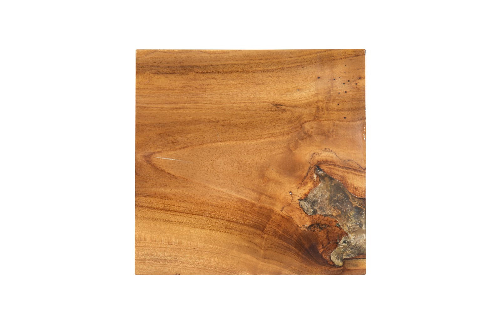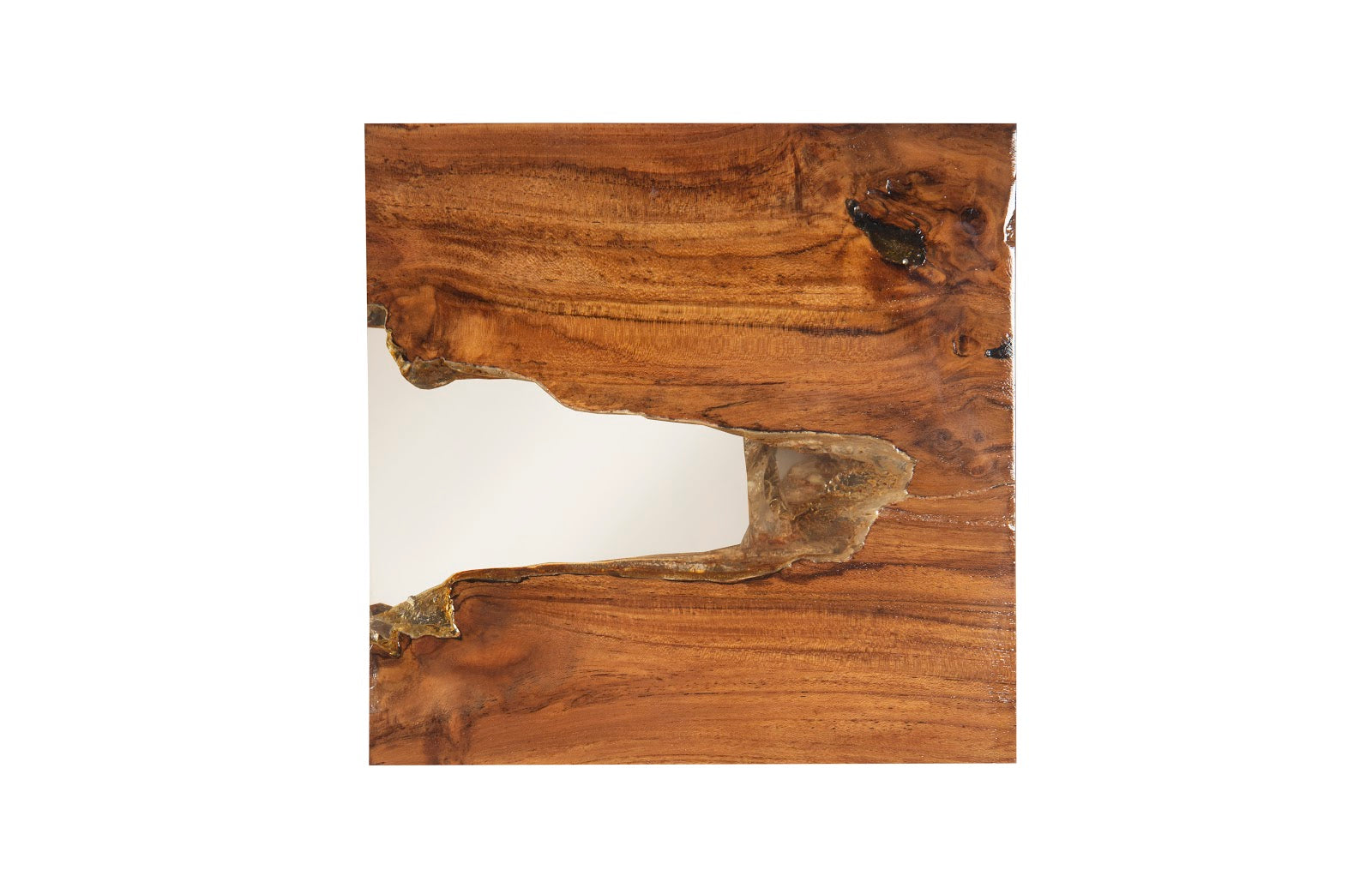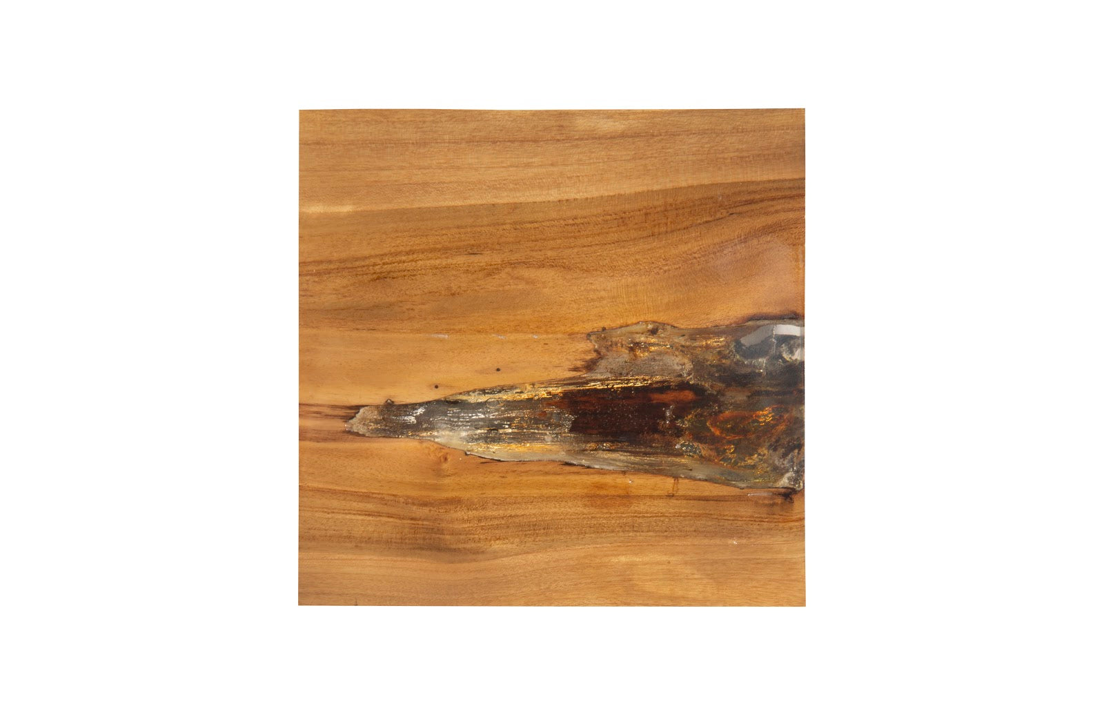 A marriage of unlikely materials creates an eye-catching juxtaposition. Resin complements wood while defining the simple shape of the wall tiles. Made from teak wood with resin and crushed glass filled cracks.