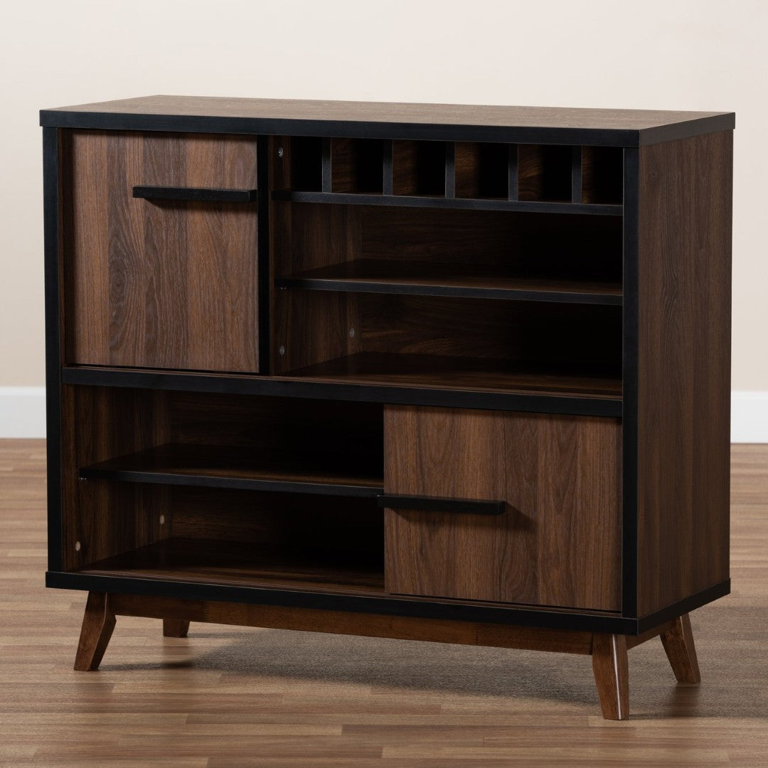 Give your entertaining space a stylish mid-century update with this Margo wine storage cabinet. Its two-tone walnut brown and black finish, low profile silhouette, and angled legs deliver retro charm while providing organized storage for bottles, glassware, and bar essentials. Designed for versatility, it’s a practical centerpiece that coordinates easily with modern and vintage furnishings.