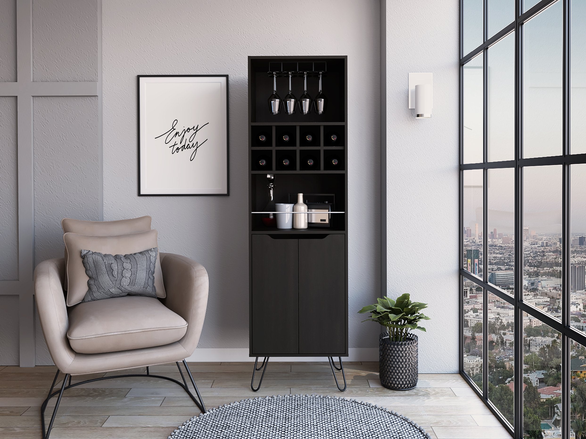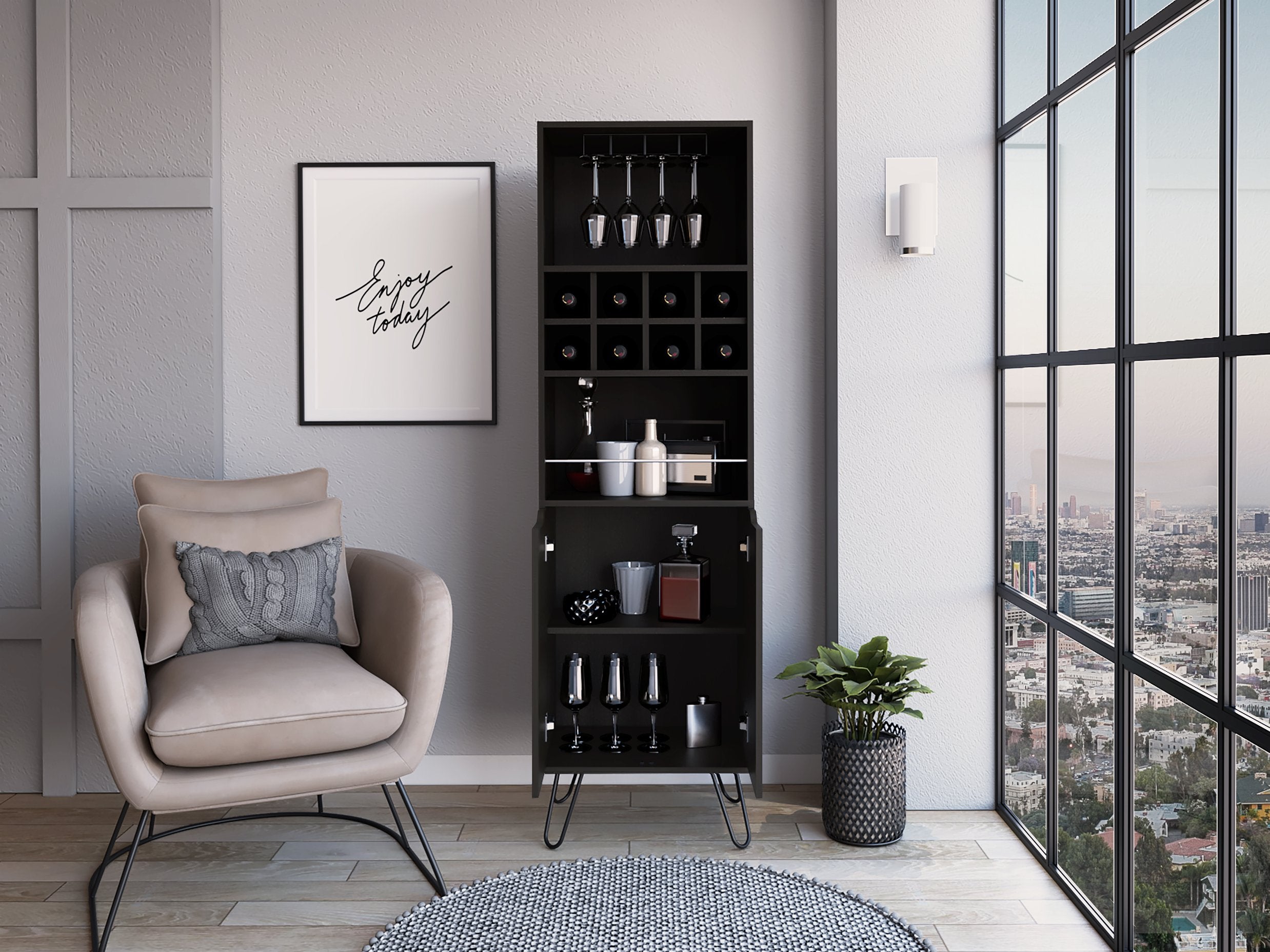 - Lower cabinet provides ample interior storage for bar accessories