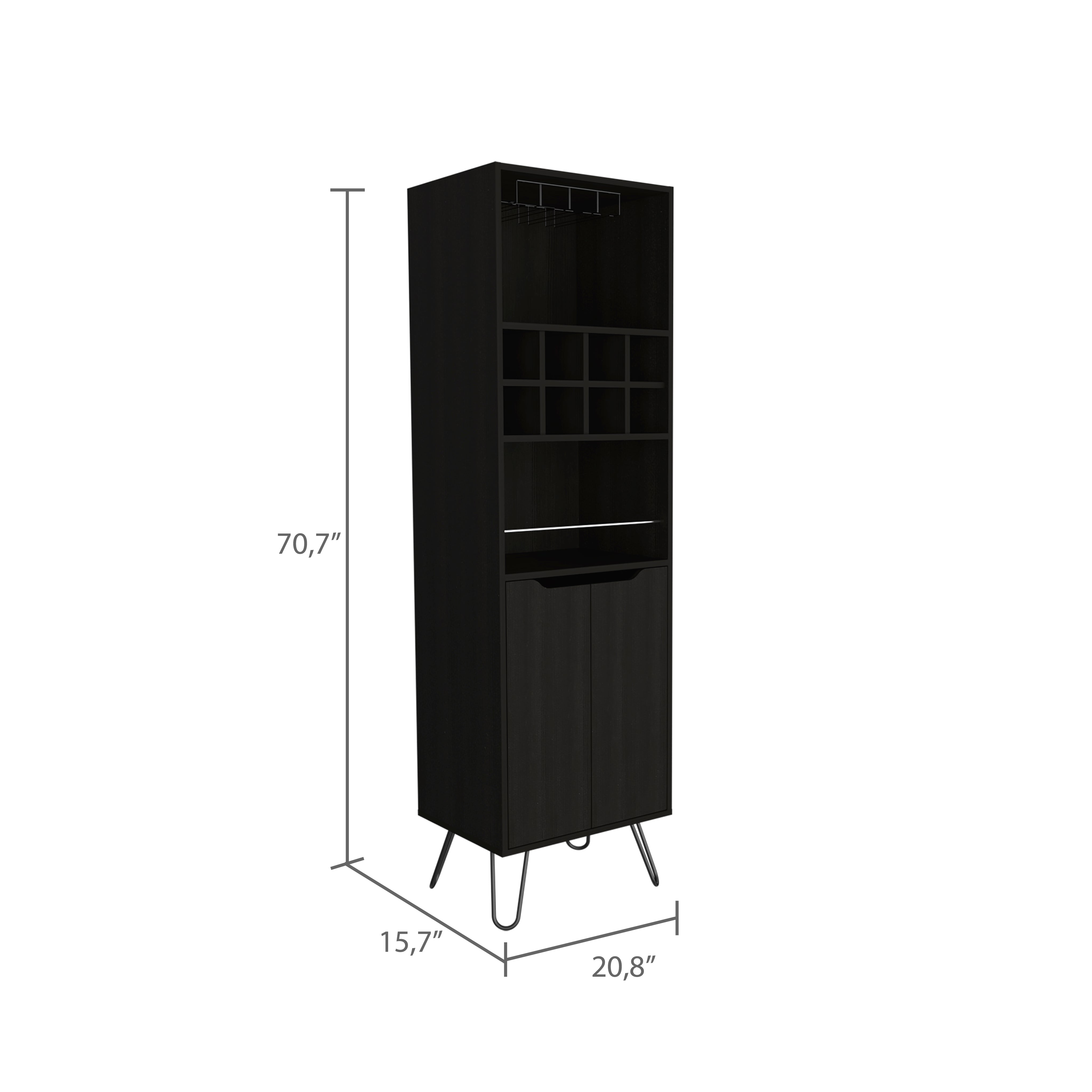 Bring contemporary style and practical storage to your home bar area with this tall, two-shelf bar cabinet. Clean lines, industrial-inspired metal legs and a single guardrail create a modern silhouette, while dedicated spaces for stemware and bottles keep everything organized and ready for entertaining. The Wenge finish and compact footprint make it an elegant, space-conscious addition to living rooms, dining areas or dens.