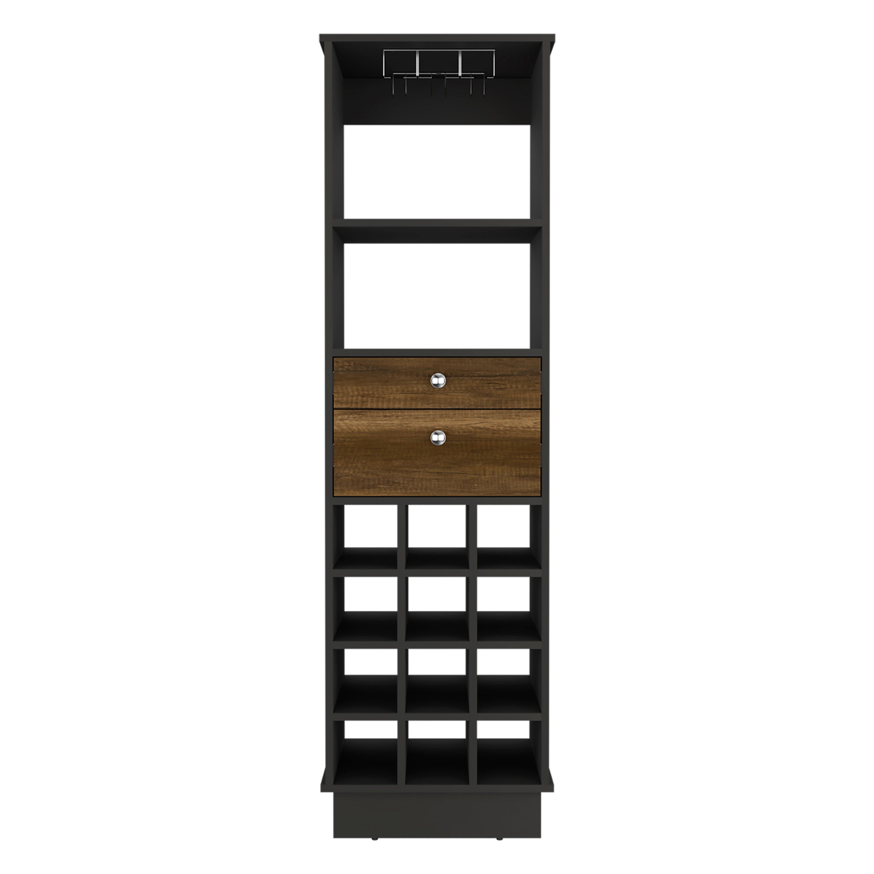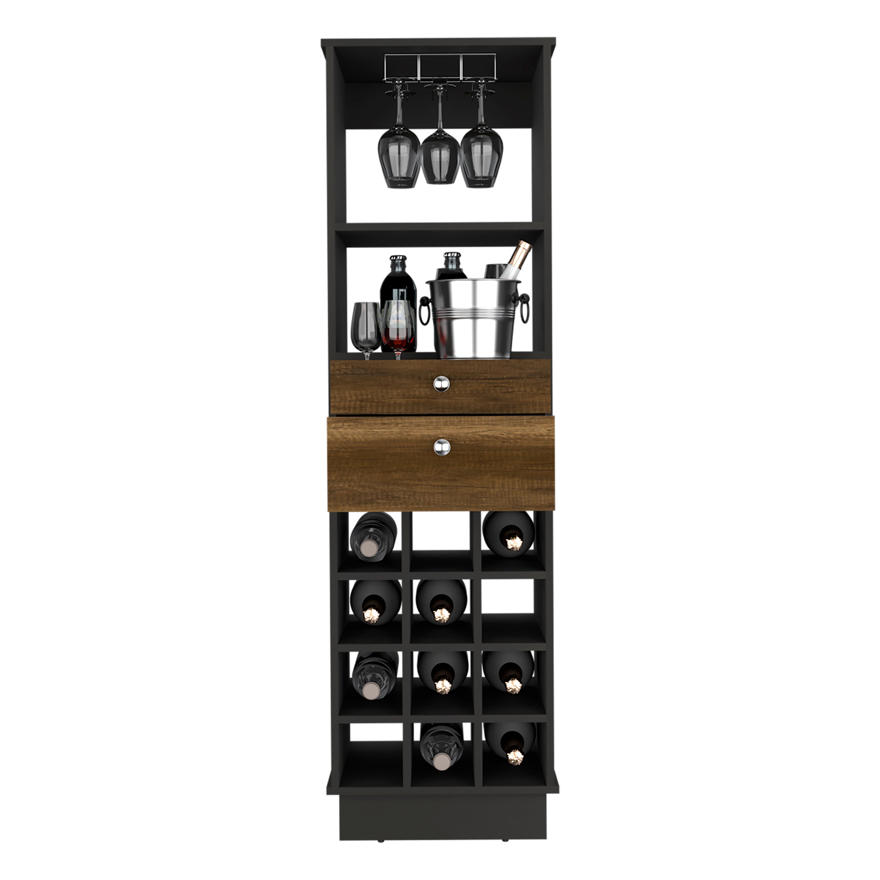 Elevate your entertaining space with this classic bar cabinet—combining practical storage and timeless design to keep bottles, glassware, and bar essentials organized and within reach. Finished in contrasting black and walnut tones, it blends with a variety of decors while offering a compact footprint ideal for apartments, dining rooms, or home bars.