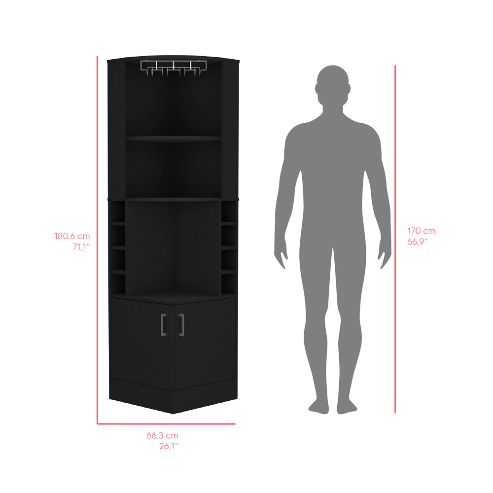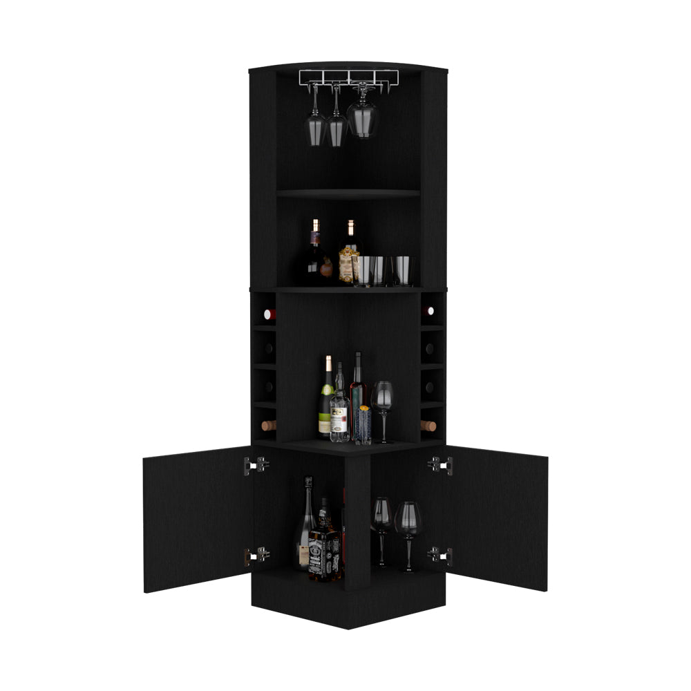 Serve drinks in style with this sleek corner bar cabinet, designed to maximize storage while fitting neatly into compact living spaces. Finished in classic black, it combines practical organization—wine cubbies, glass rack, and closed storage—with durable construction for long-lasting use.