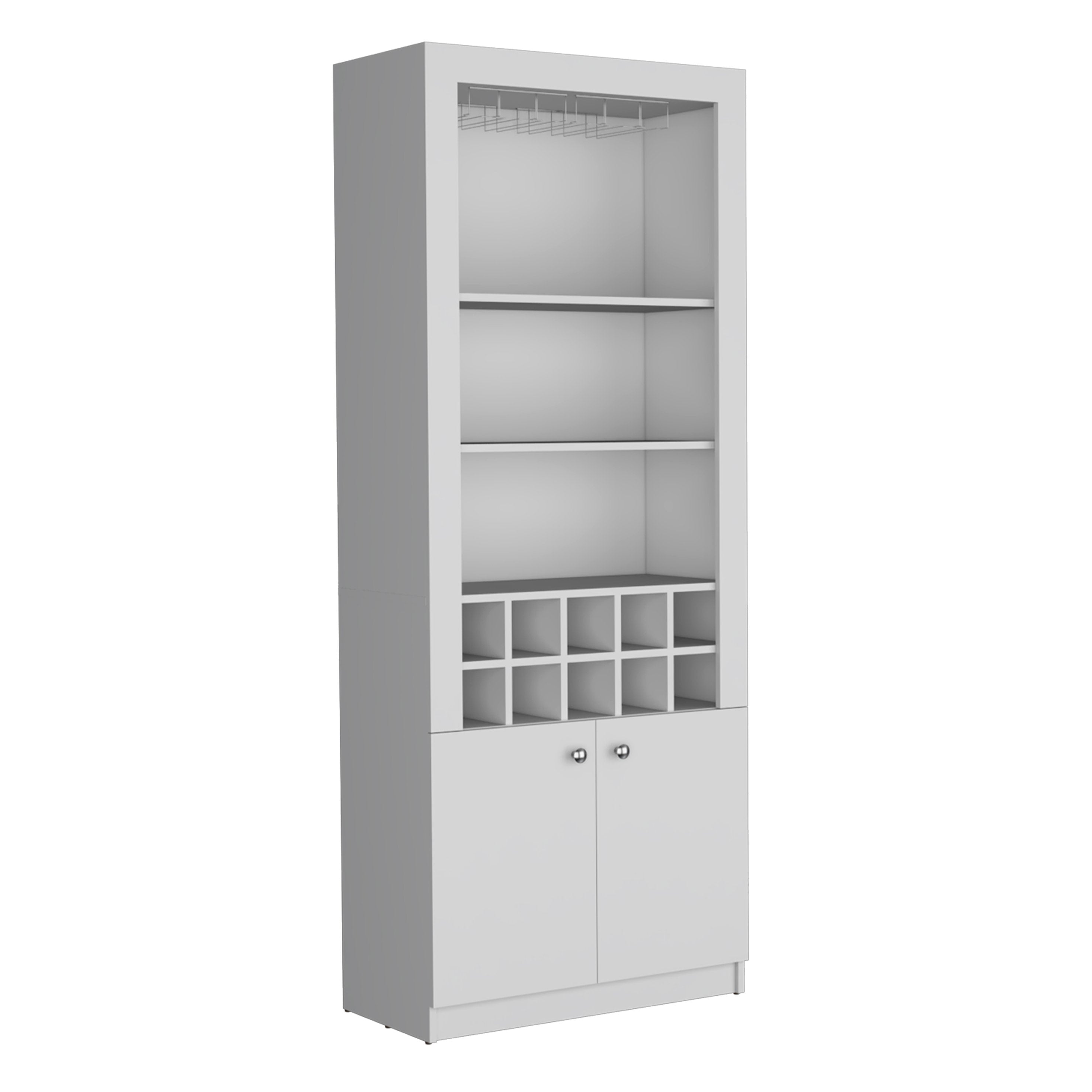 - Storage layout: Lower double-door cabinet for concealed storage, mid-section bottle cubbies, three open top shelves, and a 6-line stemware rack