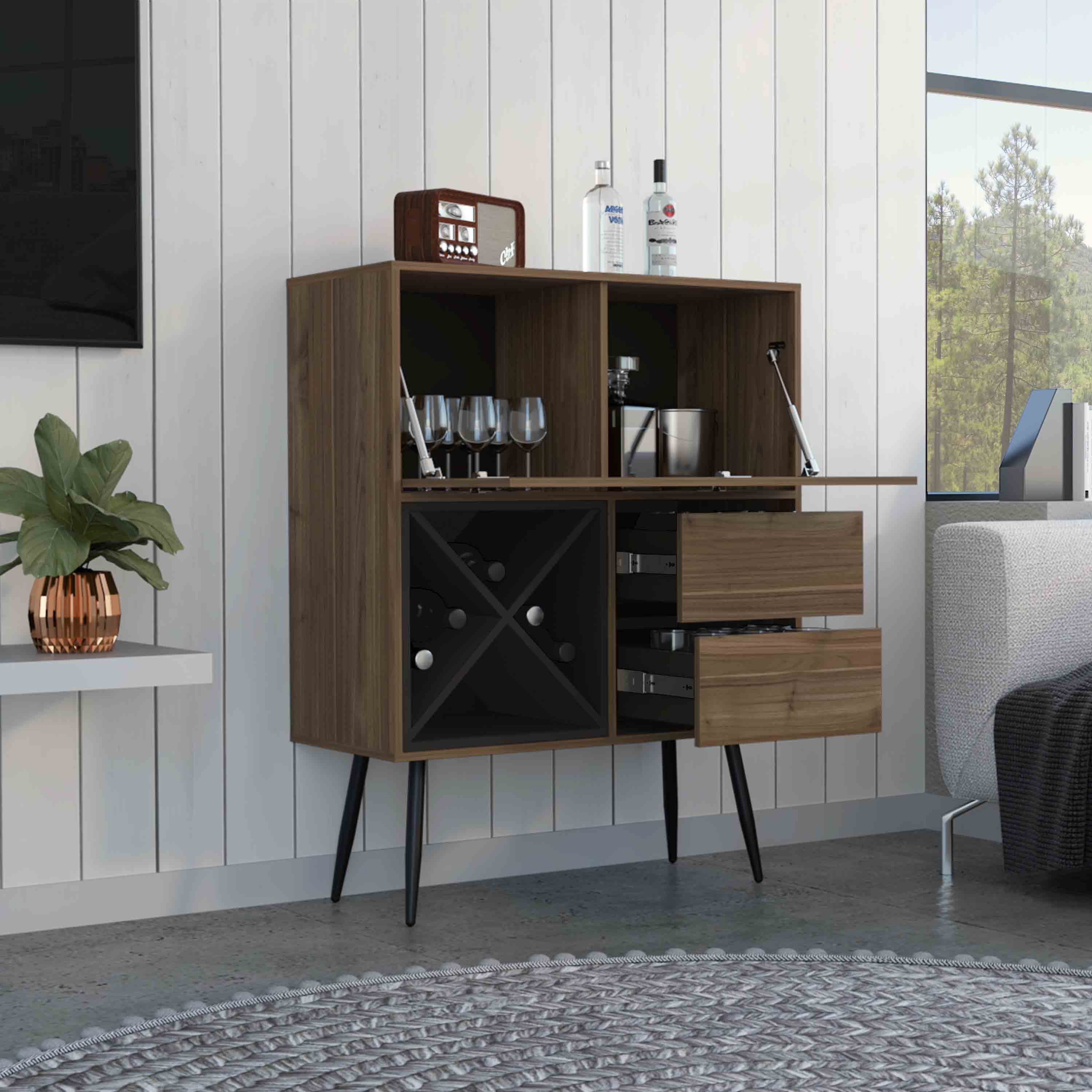 - Storage layout: One enclosed cabinet with two interior shelves for larger bottles or stemware; four bottle racks hold bottles securely; two drawers provide space for bar tools, napkins, or small accessories.